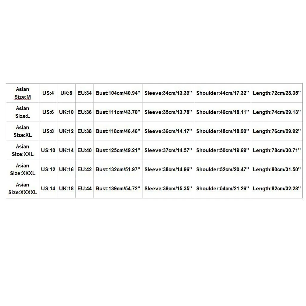 Азиатский размер США Великобритания ЕС Бюст Рукав Плечо Длина М 4 8 34 104 см/40,94'' 34 см/13,39'' 44 см/17,32'' 72 см/28,35'' L 6 10 36 111 см/43,70'' 35 см/13,78'' 46 см/18,11'' 74 см/29,13'' XL 8 12 38 118 см/46,46'' 36 см/14,17'' 48 см/18,90'' 76 см/29,92'' XXL 10 14 40 125 см/49,21'' 37 см/14,57'' 50 см/19,69'' 78 см/30,71'' XХХL 12 16 42 132 см/51,97'' 38 см/14,96'' 52 см/20,47'' 80 см/31,50'' XXXXL 14 18 44 139 см/54,72'' 39 см/15,35'' 54 см/21,26'' 82 см/32,28''