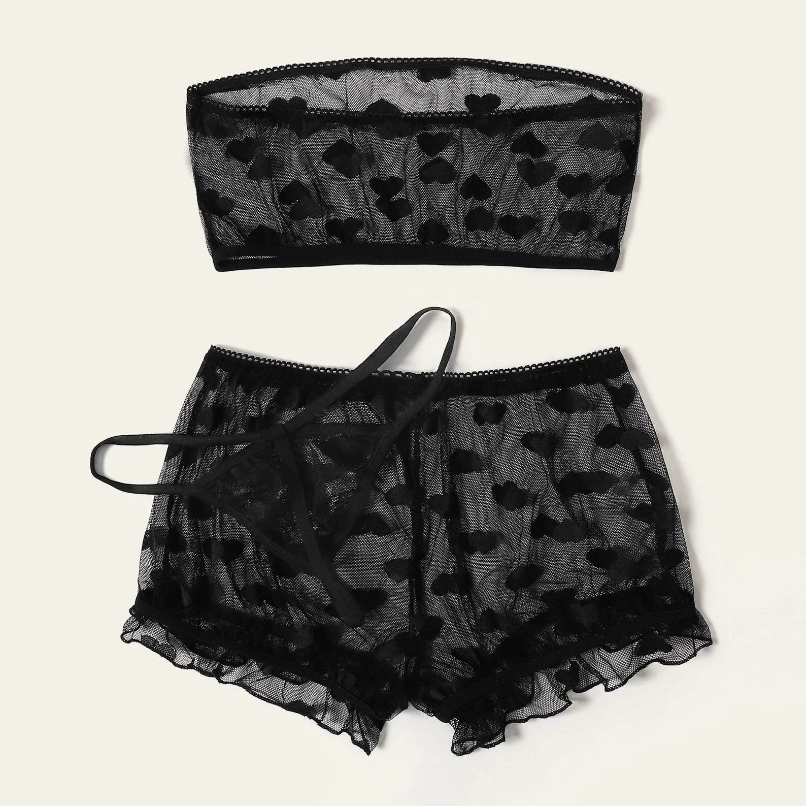 DescriptionЖенский топ без пятки, шорты, стринги с узором в виде сердца, комплект прозрачного нижнего белья с оборкой, Пижама