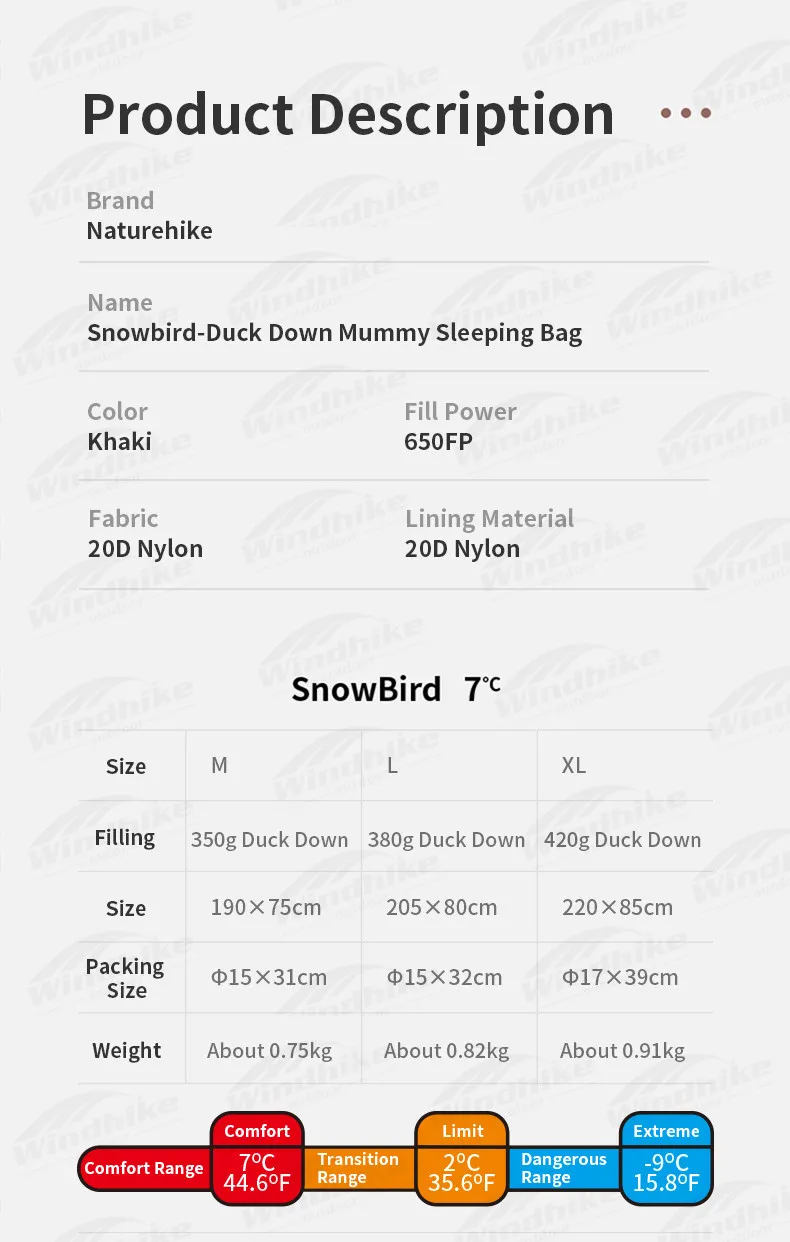 Емкость для наполнения: (Размер M) 350 г утиный пух, (размер L) 380 г утиный пух, (размер XL) 420 г утиный пух