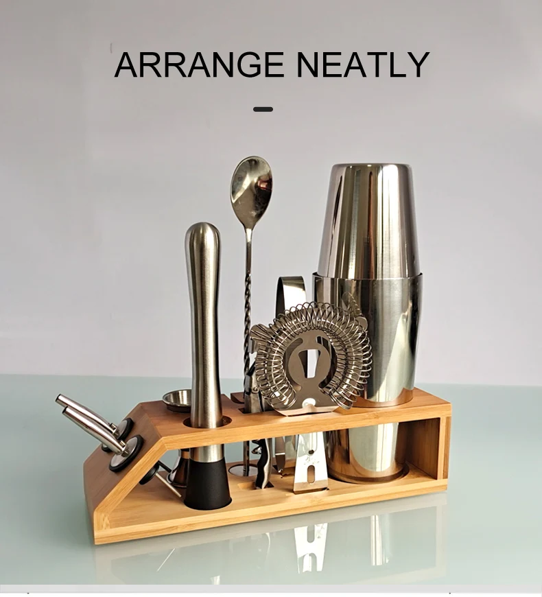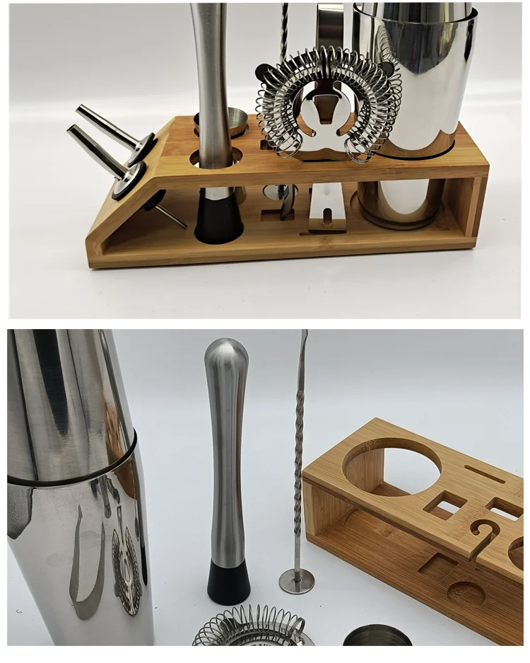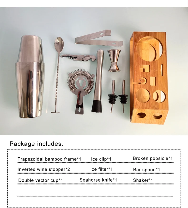 Посылка: бамбуковая подставка * 1, зажим для льда * 1, винная пробка * 2, мерная чашка * 1, кувшин * 1, ситечко для льда * 1, нож для морского конька * 1, ложка барная * 1, Boston 700 + 600 мл * 1
