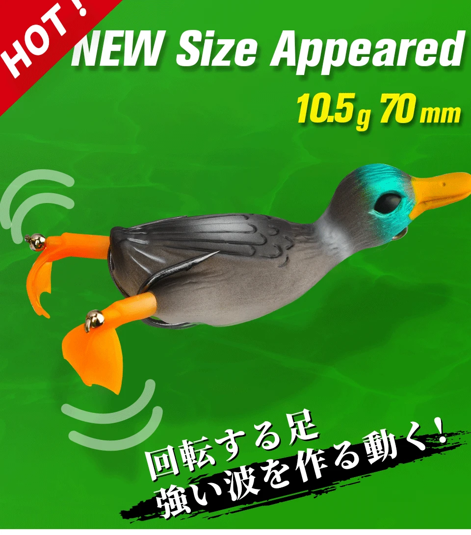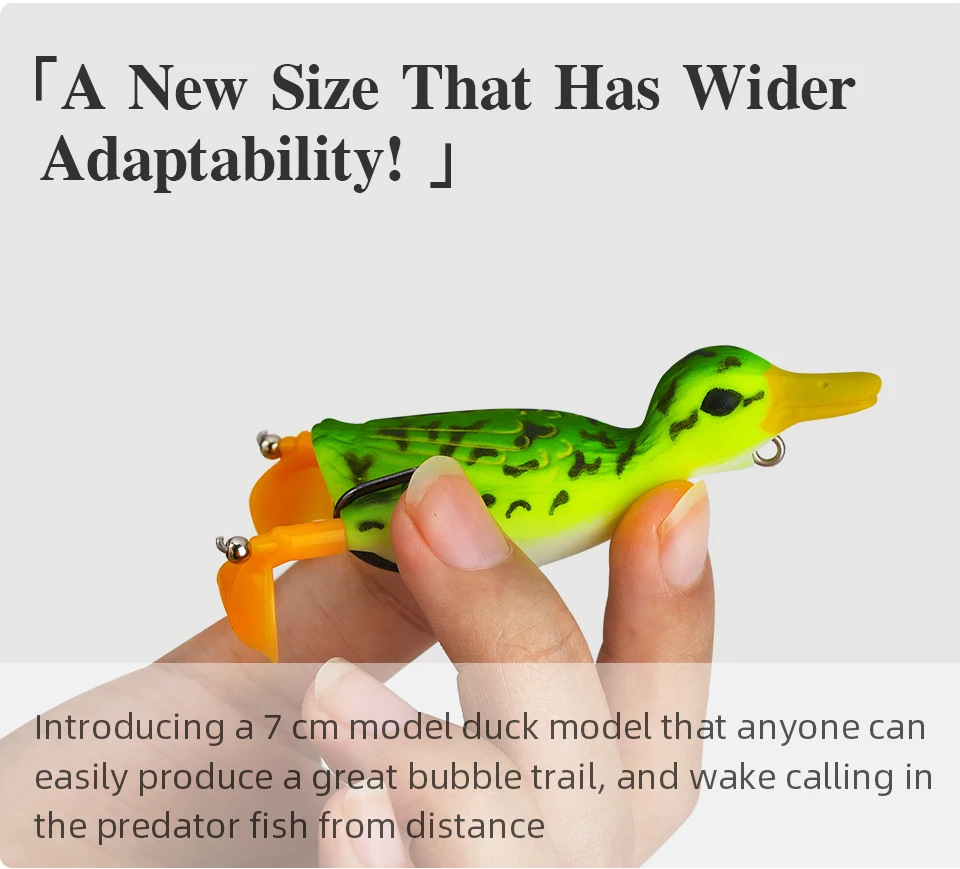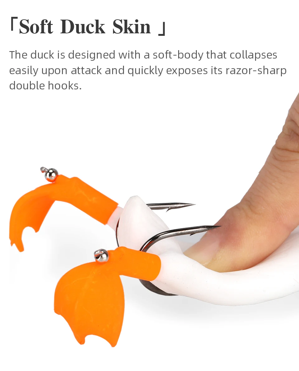 1. Вращающиеся ноги дают приманке невероятное живое действие, брызгая, оставляя большой пузырь; 2. Обладая суперострыми двойными крючками, приманка обеспечивает летальную имитацию утки, которая обязательно вызовет «скачок» в количестве вашей рыбы. 3. Утка разработана с мягким корпусом, который легко рушится при атаке и быстро разоблачает его острые двойные крючки. 4. Острые крючки не только уменьшат сопротивление при пирсинге, увеличивают проникновение, увеличивают скорость пирсинга, но и значительно повышают износостойкость и сопротивление изгибу крюка. 5. Супер реалистичный утенок сверху имитация воды приманка загружена с инновационными особенностями! Утка гибкая и остается идеально настроенной навсегда!