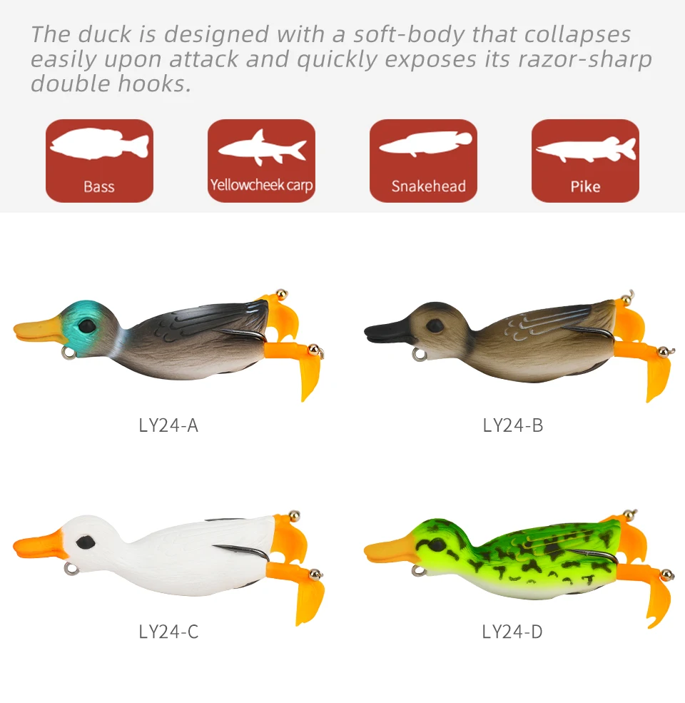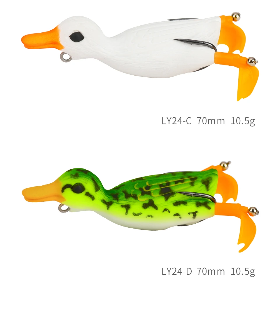 1. Название: LY24 2. Тип: Сверху вода с изображением утки, лягушки, мягкие приманки для рыбалки 3. Длина: 70 мм 4. Вес: 10,5 г 5. Крючки: острые двойные крючки 6. Цвета: 4 цвета 7. Качество: 1 шт.