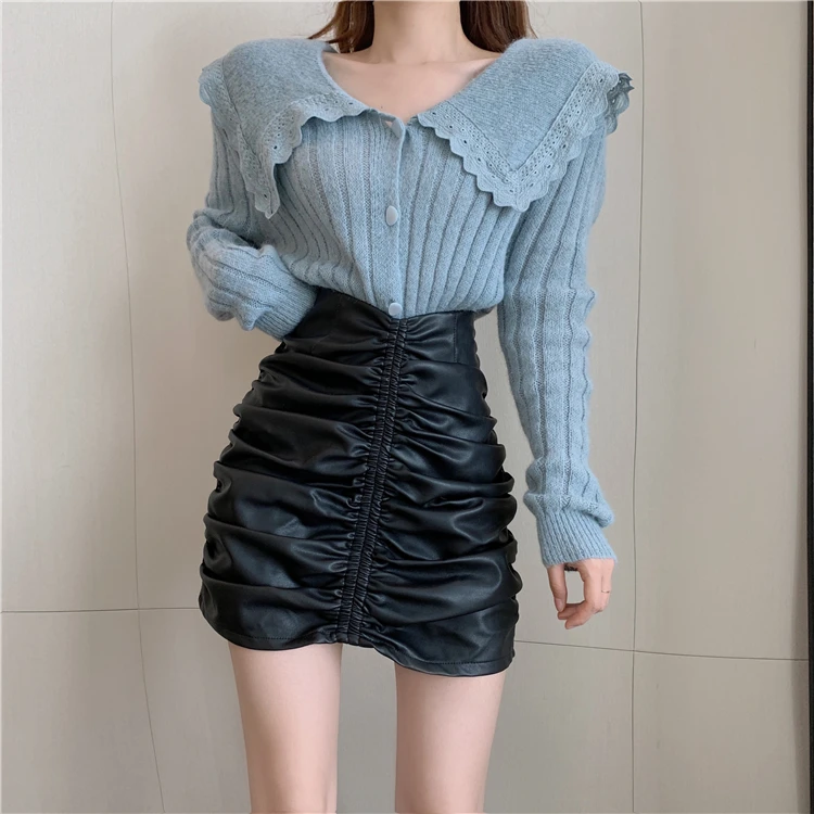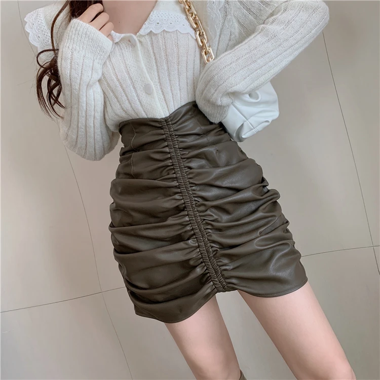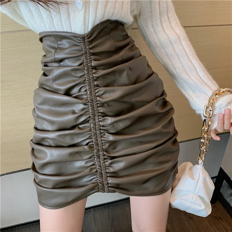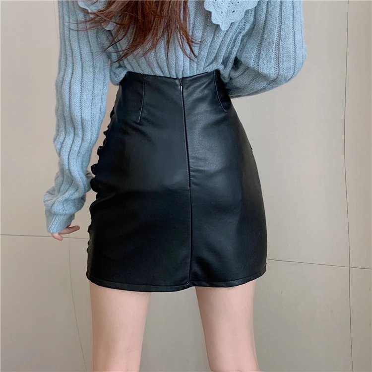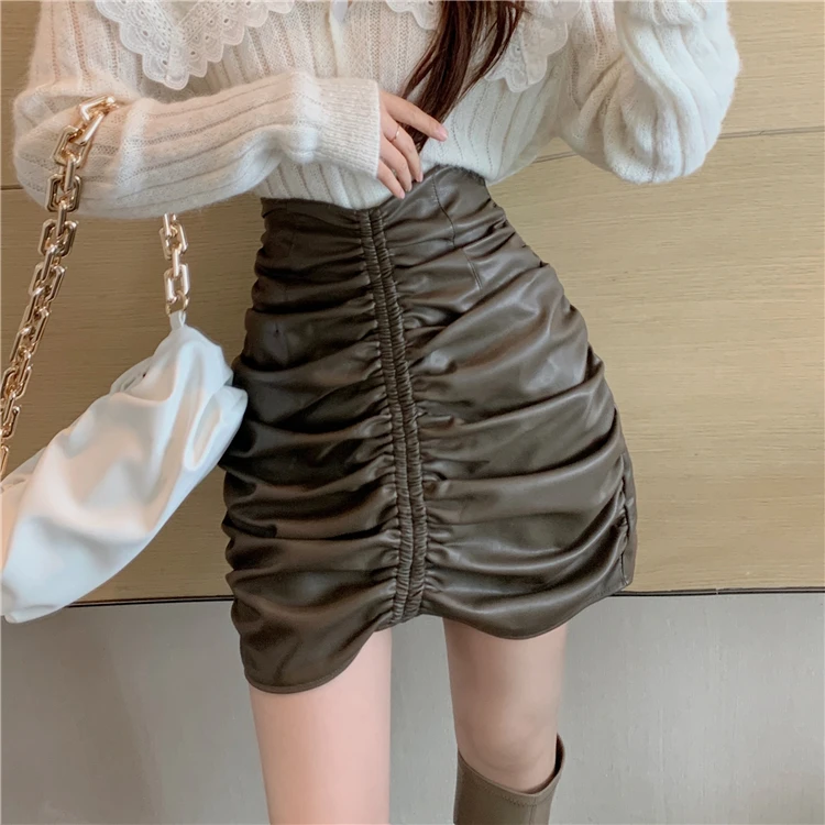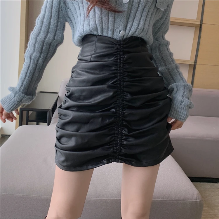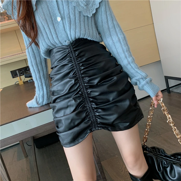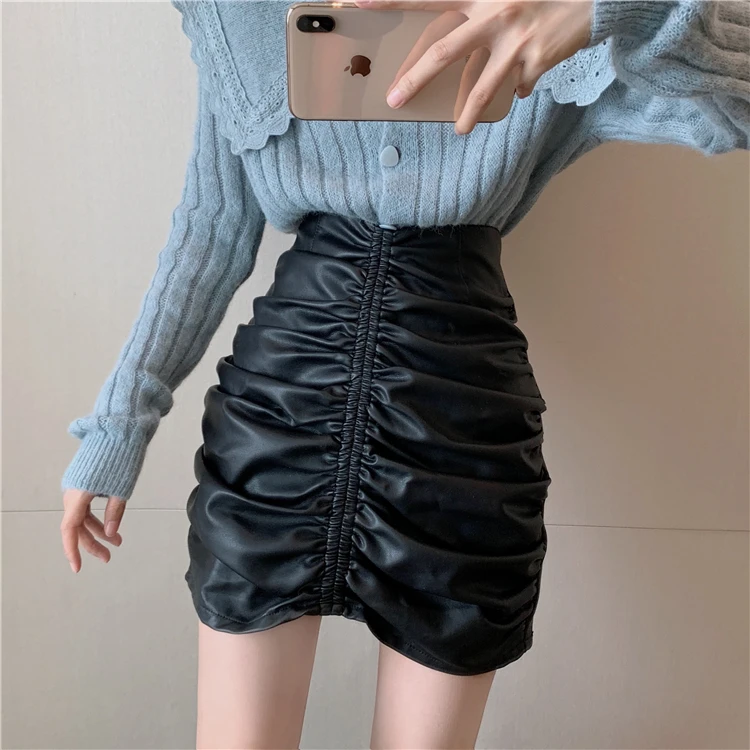 Черная плиссированная мини-юбка из искусственной кожи, Женская юбка-карандаш с высокой талией, дизайнерская Корейская Осенняя юбка на молнии размера плюс X767