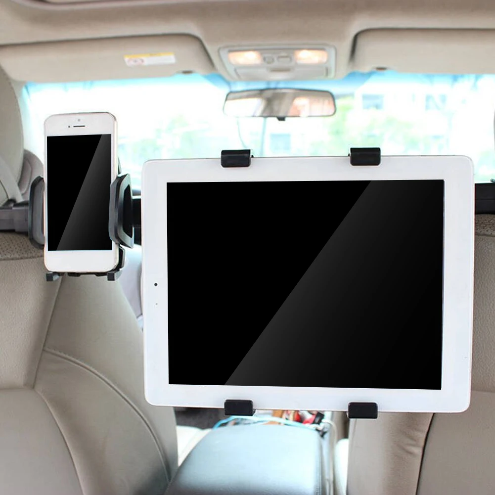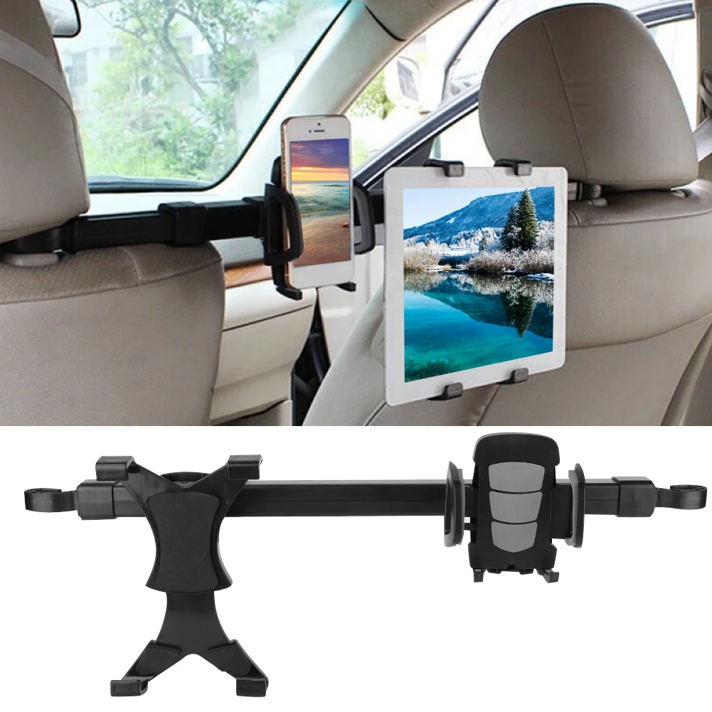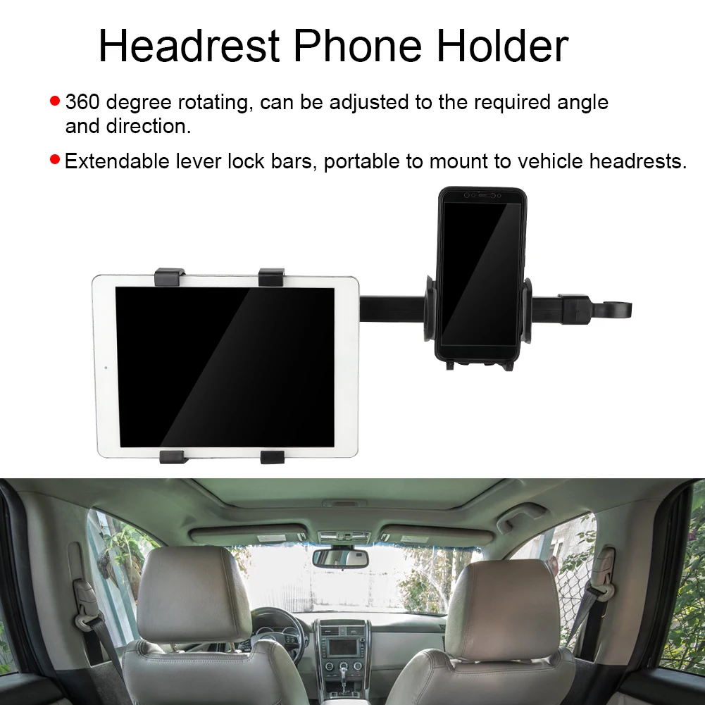 Вращение на 360 градусов, может регулироваться под требуемым углом и направлением. Выдвижной рычаг блокировки баров, портативный для крепления на подголовники транспортного средства. Два держателя, позволяет надежно удерживать мобильный телефон и планшет одновременно. Подходит для iPad/планшетов (12-20 см), мобильные телефоны (6-10,5 см) и планшета стиль ДВД-плеера. Превратит ваш смартфон в развлекательную систему заднего сиденья в автомобиле. Идеально подходит для путешествий с детьми, семьей и друзьями.
