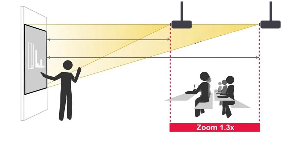 Большой диапазон масштабирования позволяет использовать несколько вариантов размещения на различных расстояниях от проекционного экрана. Преимущество заключается в том, что дорогие взаимозаменяемые проекторы линз могут быть заменены более экономичным решением, сохраняя при этом разнообразный выбор вариантов позиционирования.