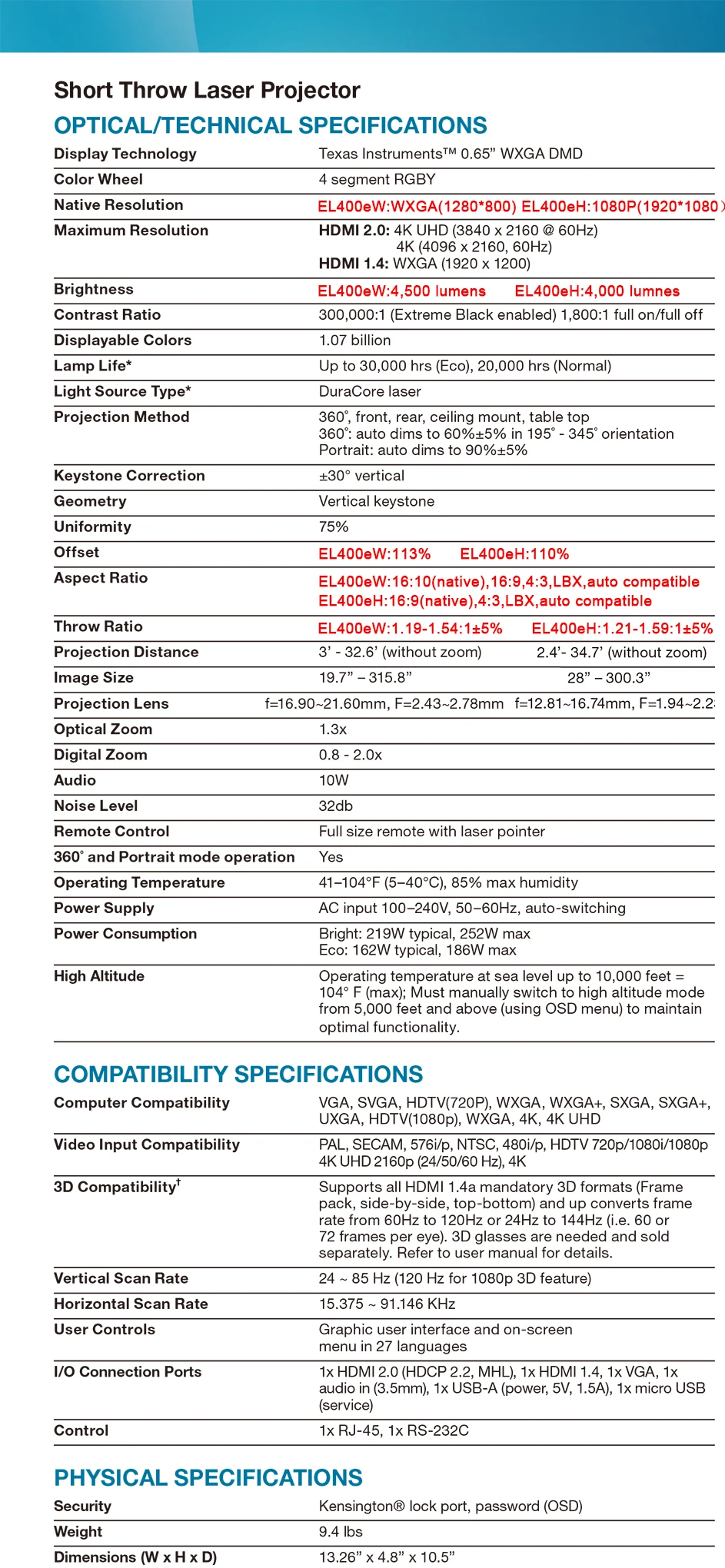 Серия EL400 способна принимать собственные сигналы 4K и совместима с HDR10. Высокая технология динамического диапазона (HDR) Улучшает контрастность, яркость и глубину цвета на дисплее, обеспечивает более яркие белые и более глубокие уровни черного цвета. Это улучшает детали и глубину поля, делает изображения более четкими и реалистичными.
