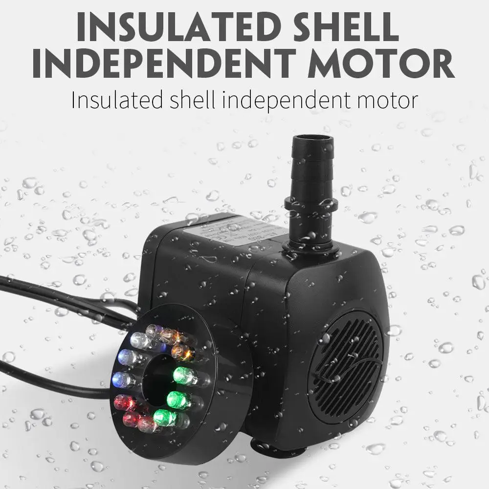 【 12 светодиодных ламп 】насос для фонтана использует 12 супер ярких энергосберегающих светодиодных красочных огней. Светодиодные лампы водяного насоса обеспечивают удивительное ночное освещение и являются водонепроницаемыми. Идеально подходит для украшения крытых фонтанов, бассейнов, домашних фонтанов, водоемов, аквариумных насосов, гидропоники, статуи