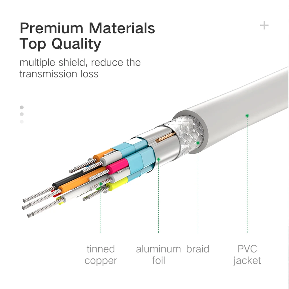 -Проводники из голой меди, а также Экранирование из фольги и оплетки вместе обеспечивают превосходную производительность кабеля и надежное подключение.