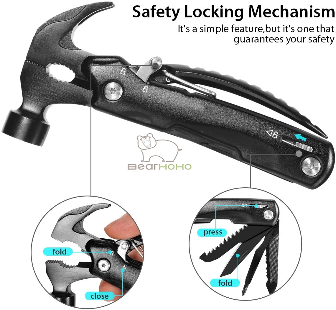 1. Высокопрочная углеродистая сталь Hammer, высокая твердость, высокая коррозионная стойкость, мощная, может легко противостоять различным твердым предметам 2. Ручка из высокопрочной углеродистой стали, приятная на ощупь, не линяет, удобная 3. Многофункциональные гаджеты, тонкая работа, гладкие линии, красивый внешний вид, очень подходит для ношения на улице 4. Фиксированная ручка замка безопасности для удобного хранения