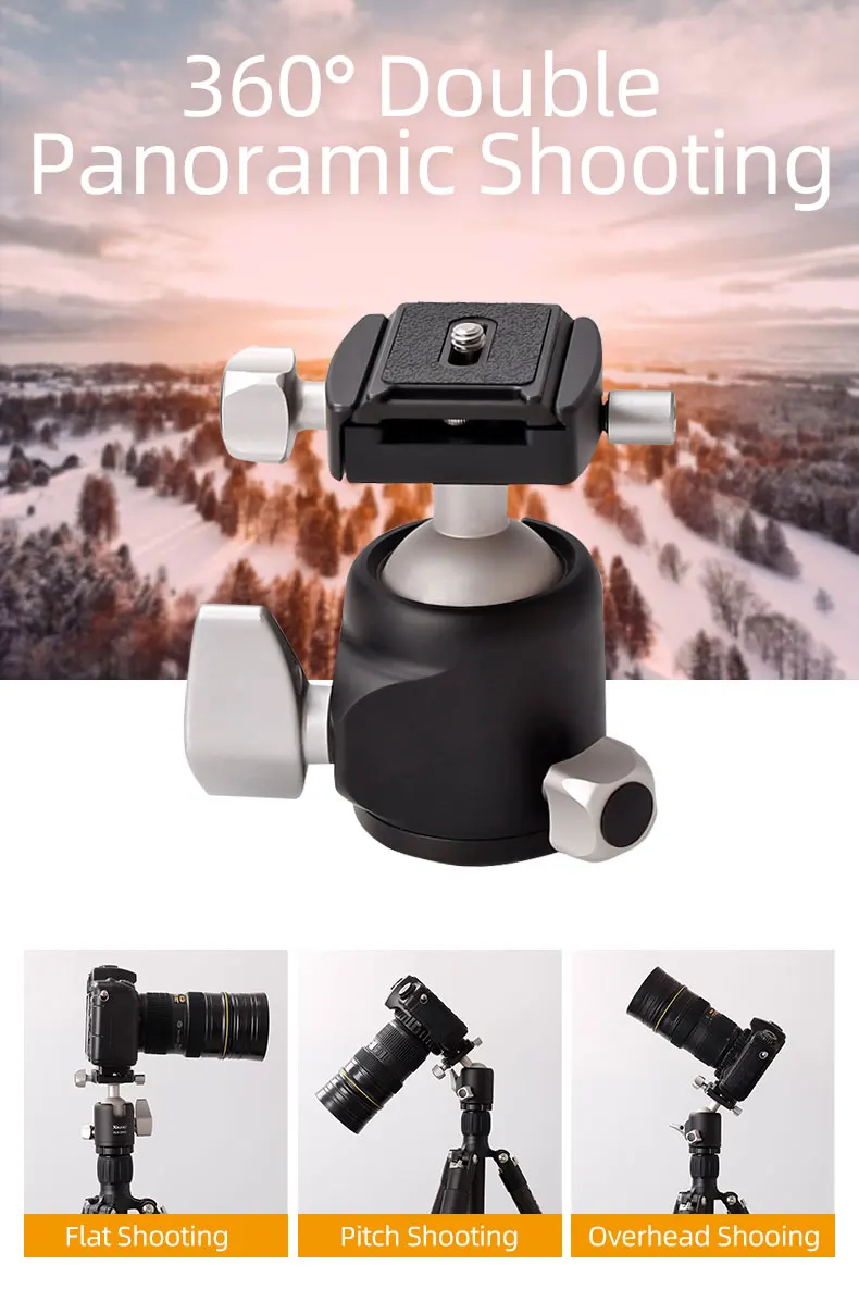 Оснащен большим диаметром шара 31 мм, шаровая Головка позволяет ему поддерживать тяжелое оборудование до 12 кг. Совместим с большинством быстроразъемных пластин Arca-type, Характеристики головки способны панорамировать на 360 °, с одним нотшем на основании, что позволяет головке достигать угла наклона 90 °, позвольте вам получить бесплатные углы съемки и удивительную панораму. Центральная ось может быть перевернута для ультра низкого угла и макросъемки.