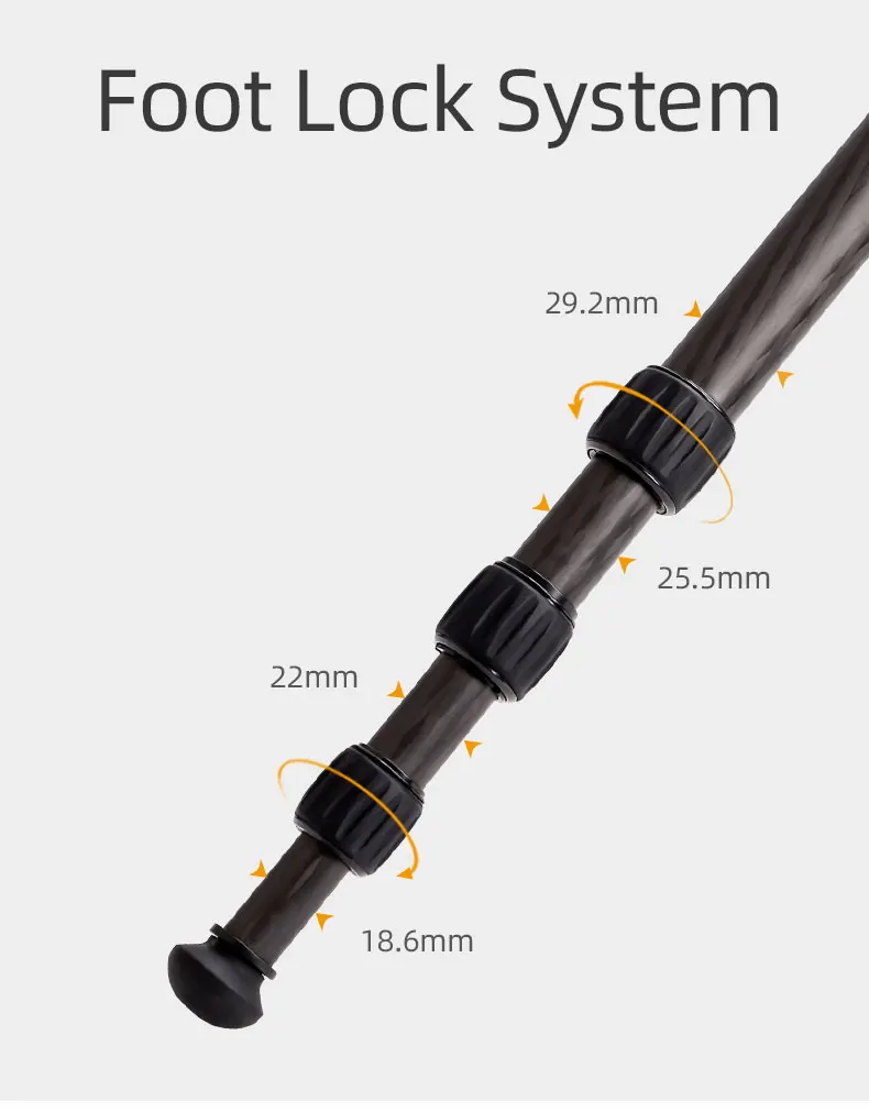 8x Ножки штатива из углеродного волокна обеспечивают стабильность и амортизируют вибрации, минимизируя вес, не жертвуя прочностью; С максимальным диаметром ноги 29,2 мм, держа снаряжение весом до 12 кг, что делает его пригодным для установки DSLR, компактные видеокамеры и цифровые кинокамеры