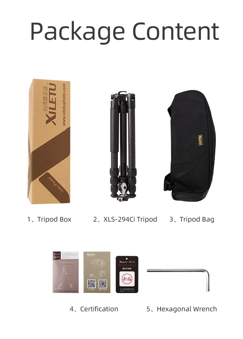 Бренд: XILETU Модель: XLS-294Ci (включая головку штатива) Тип: Профессиональный штатив из углеродного волокна Основной материал: углеродное волокно Вес изделия: 1680 г Грузоподъемность: 12 кг Секции ног: 4 Длина в сложенном виде: 430 мм Высота с центральной колонной: 1530 мм Высота без центральной колонны: 1265 мм