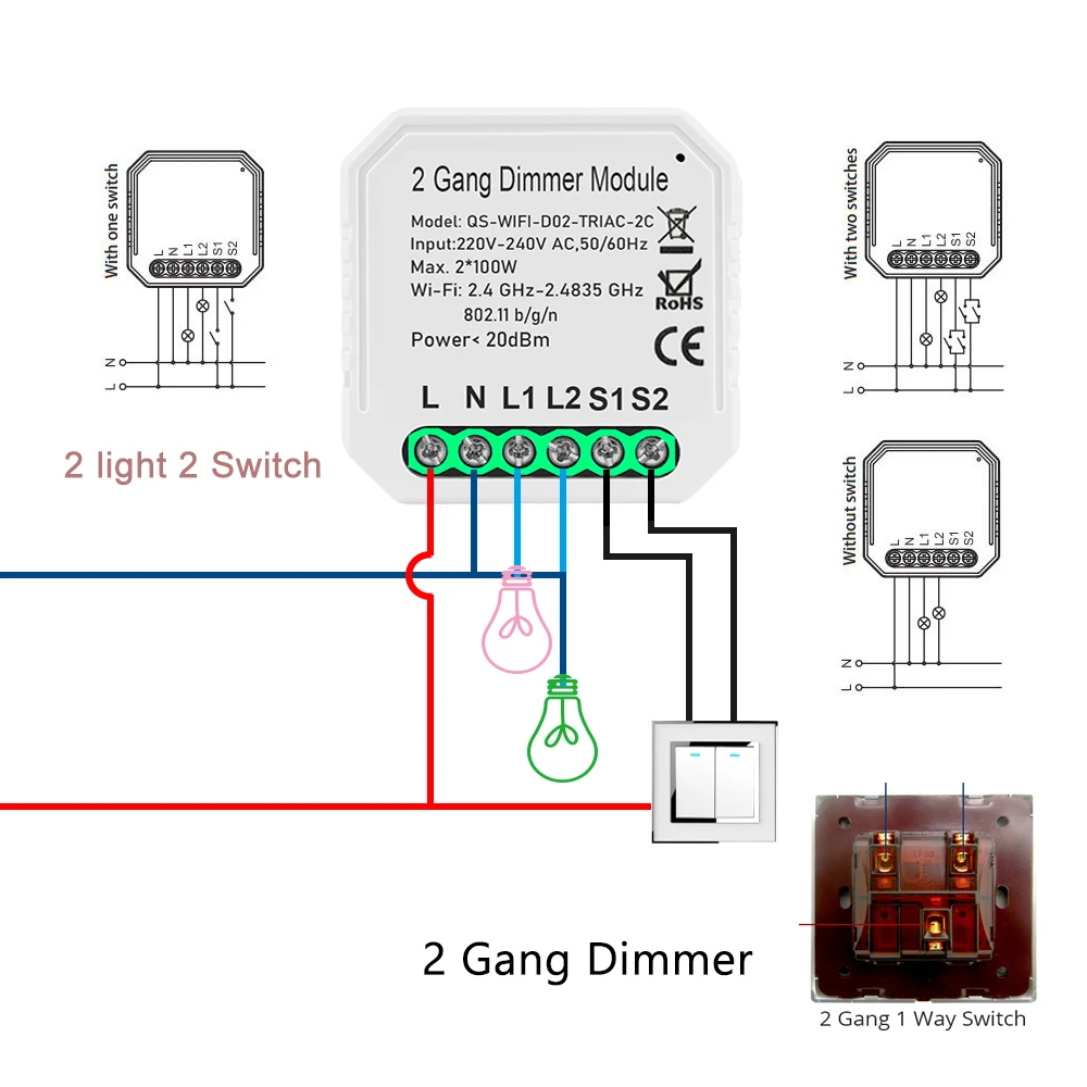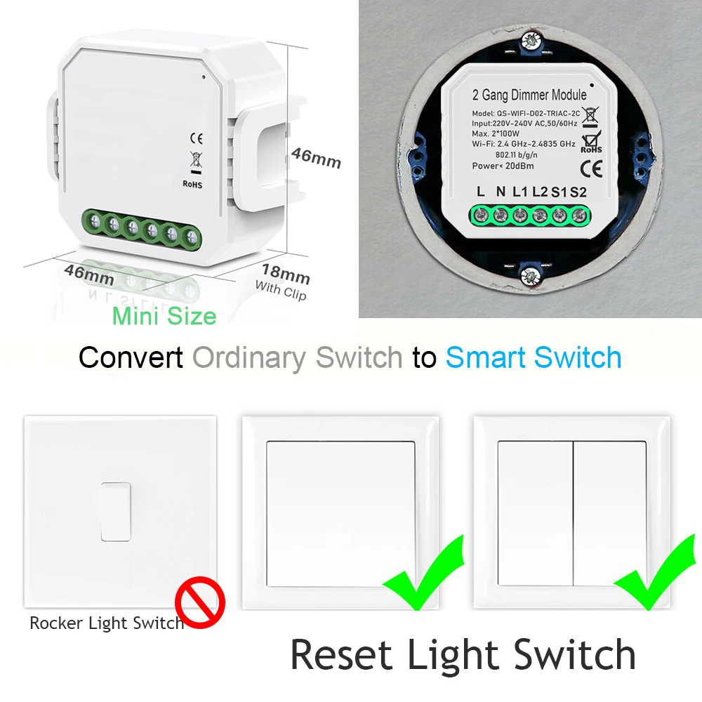 Модуль работает с ручным выключателем стены, поэтому после установки модуля в коробке выключателя, оригинальный механический переключатель по-прежнему работает. Дистанционное управление с помощью приложения, голосовое управление, настенный выключатель.