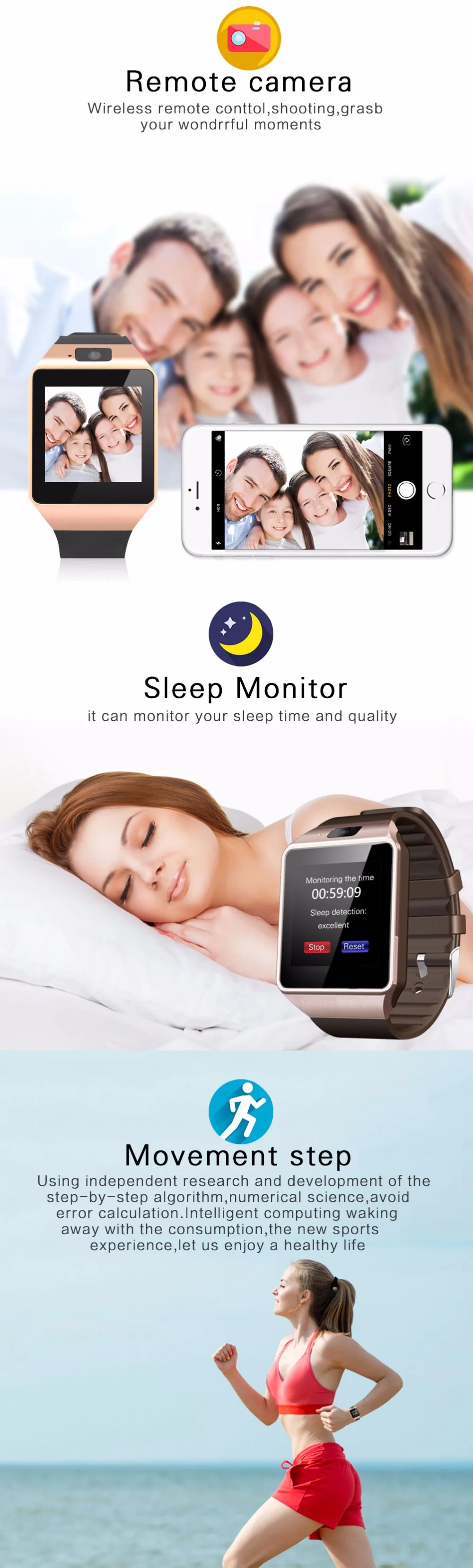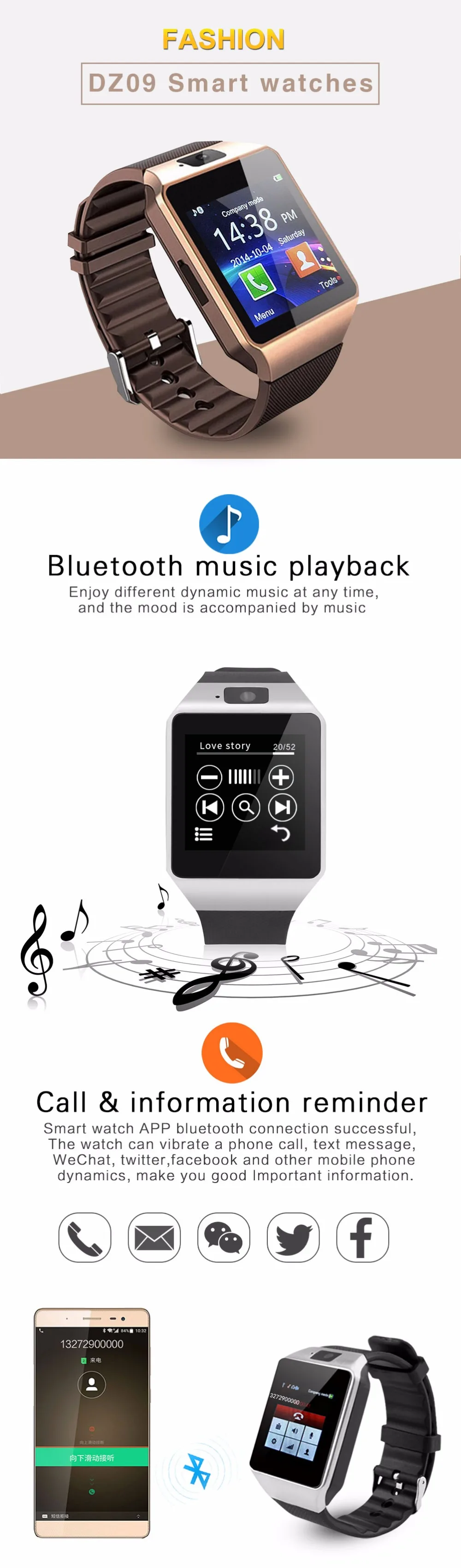 -Поддержка sim-карты (один слот) для прямого вызова и sms -Поддержка вызова/ответа на телефонный звонок (с помощью подключения Bluetooth) -Простая синхронизация между подключенным смартфоном и smartwatch DZ09 -Управляйте музыкальным проигрывателем с ваших часов -Снимайте фотографии с часов, Управляйте смартфоном -Мониторинг сна-мониторинг качества сна -Шагомер-запись шагов и достижение ваших целей -Напоминание о малоподвижности -WhatsApp и wechat уведомления через Bluetooth Сопряжение (не поддерживает iOS iPhone) -Анти-потеря/телефон finder