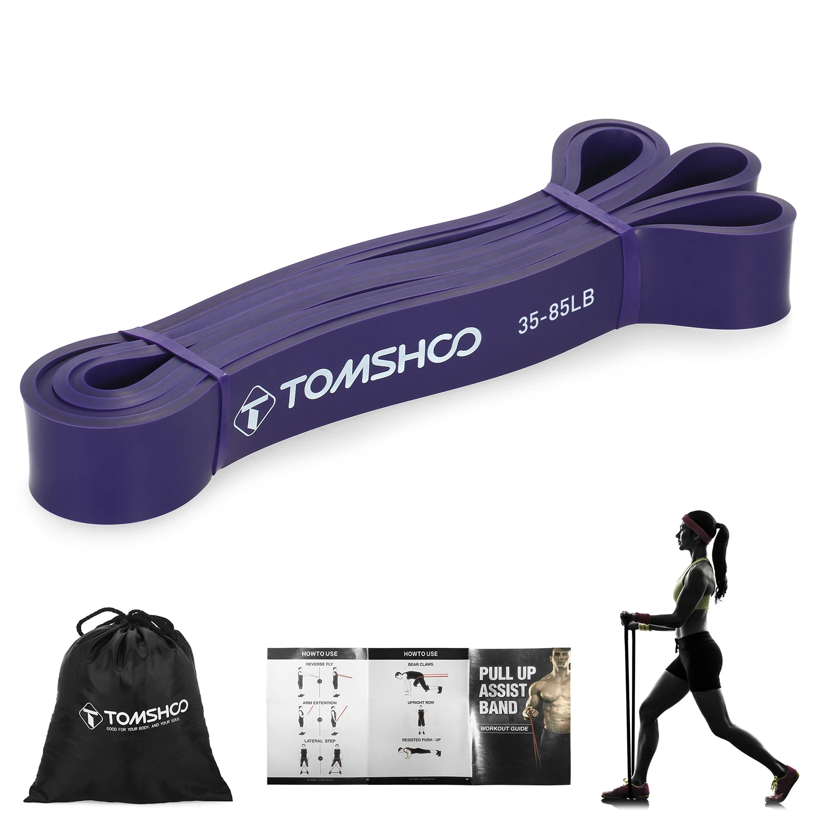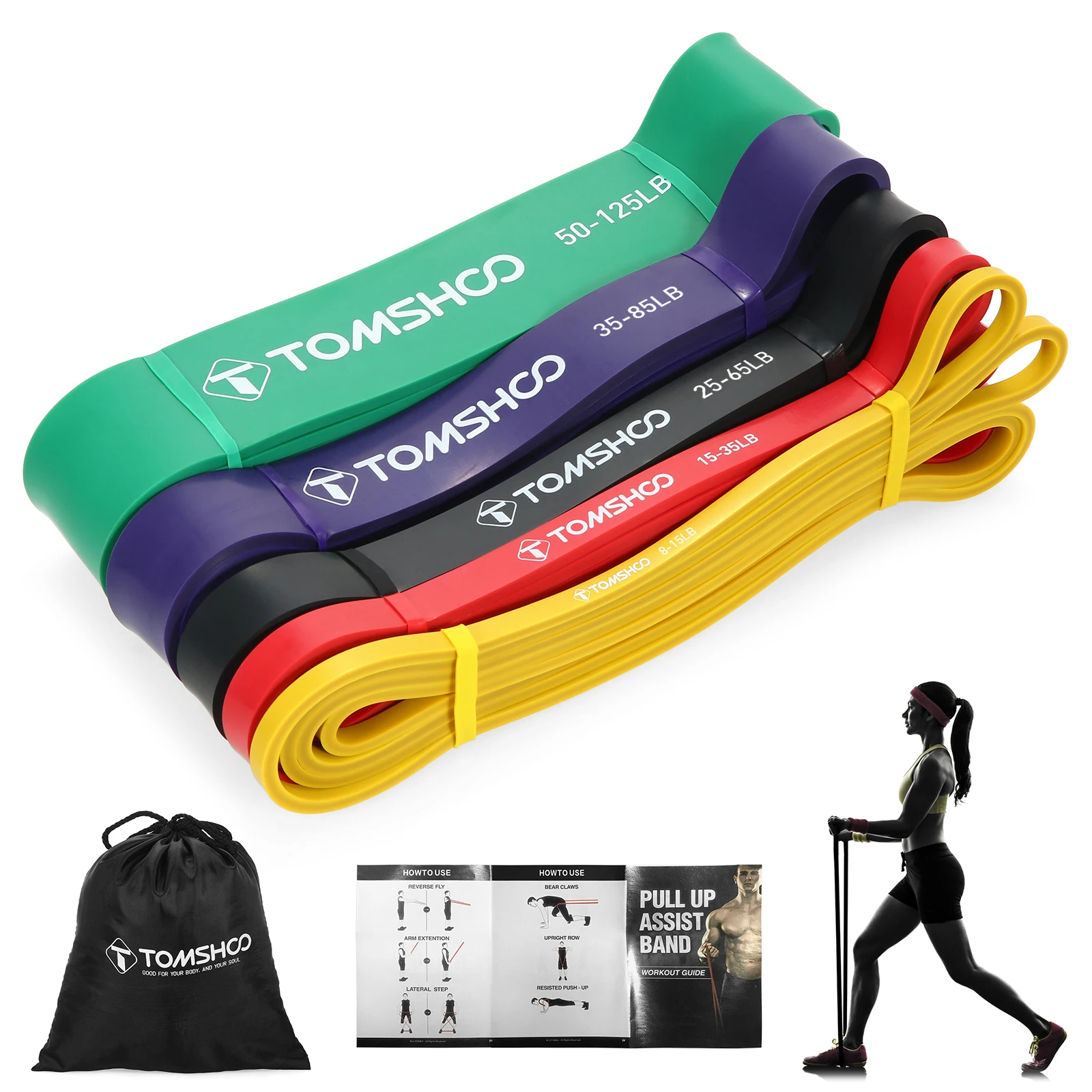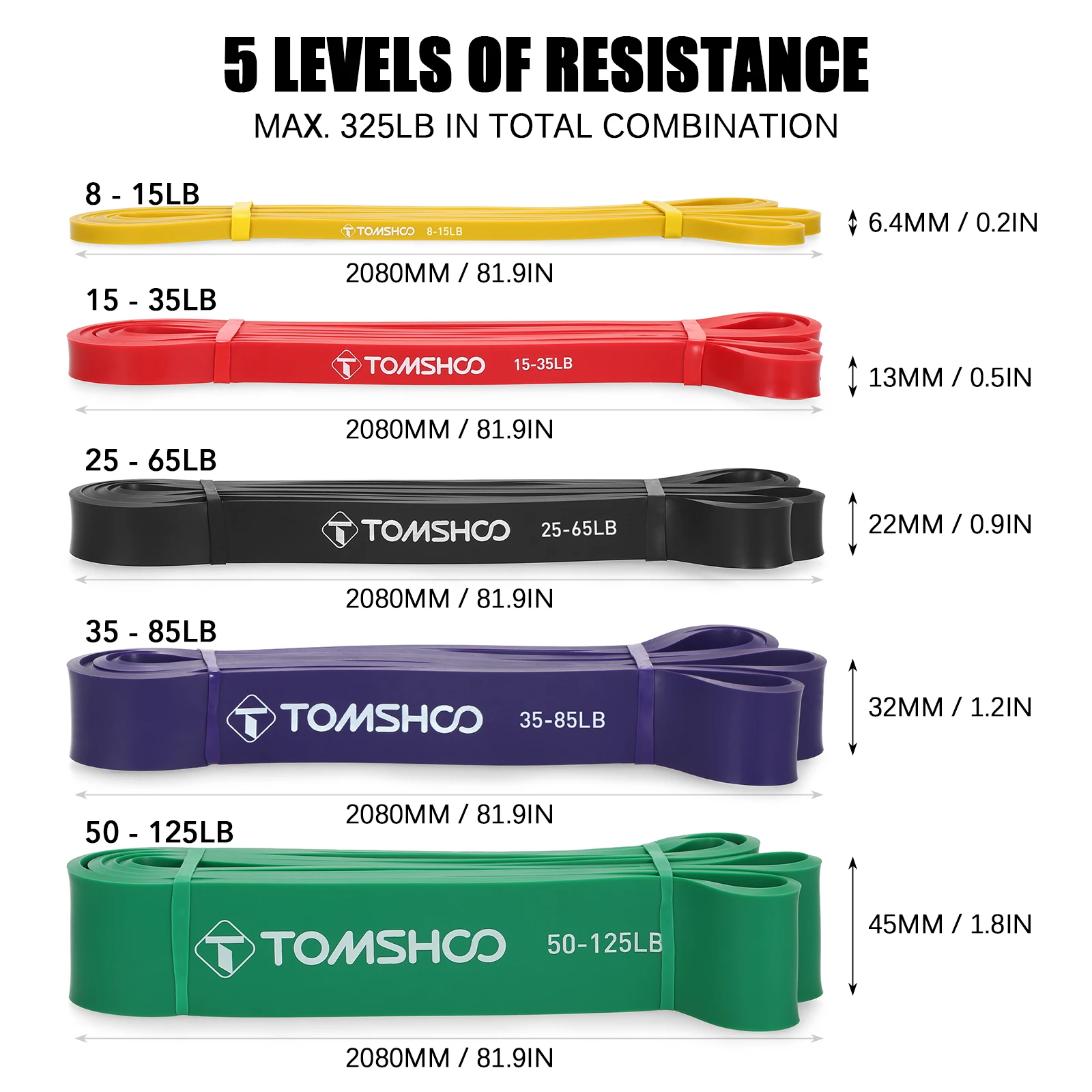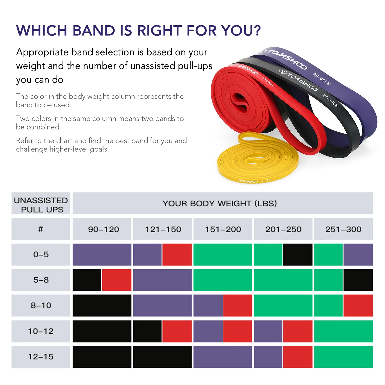 Каждая полоса с разными цветами и четко обозначена диапазоном натяжения: желтый 8-15 фунтов, красный 15-30 фунтов, черный 25-65 фунтов, фиолетовый 35-85 фунтов, Зеленый 50-125 фунтов.