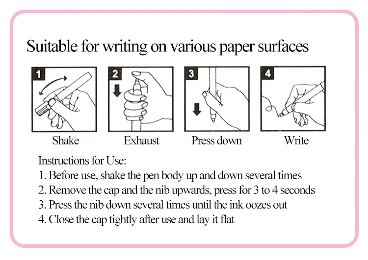 Инструкция по применению 1. Перед использованием несколько раз встряхните перо вверх и вниз 2. Снимите колпачок и перо вверх, нажмите в течение 3-4 секунд 3. Нажмите перо несколько раз вниз, пока чернила не соскальзывают 4. Плотно закройте крышку после использования и Уложите ее плоско