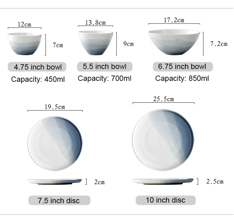 Название продукта: набор керамической посуды Материал: фарфор Стиль: японский, простой Процесс: под глазурью Тип: чаша 4,75 дюйма/чаша 5,5 дюйма/чаша 6,75 дюйма/тарелка 7,5 дюйма/тарелка 10 дюймов Характеристика: Изделие гладкое, без заусенцев, имеет приятный вкус Безопасно для микроволновой печи, гладкая поверхность и легко моется Первоклассный фарфор, высокотемпературная аэрозольная краска для поддержания стойкости цвета Слияние творчества и моды Высококачественные нетоксичные фарфоровые материалы Различные размеры для удовлетворения семейных потребностей Хорошие противоскользящие и противоскользящие свойства Это используется для ужин. Салат и завтрак Изысканные Подарки для родственников и друзей также подходят для отелей, ресторанов или баров