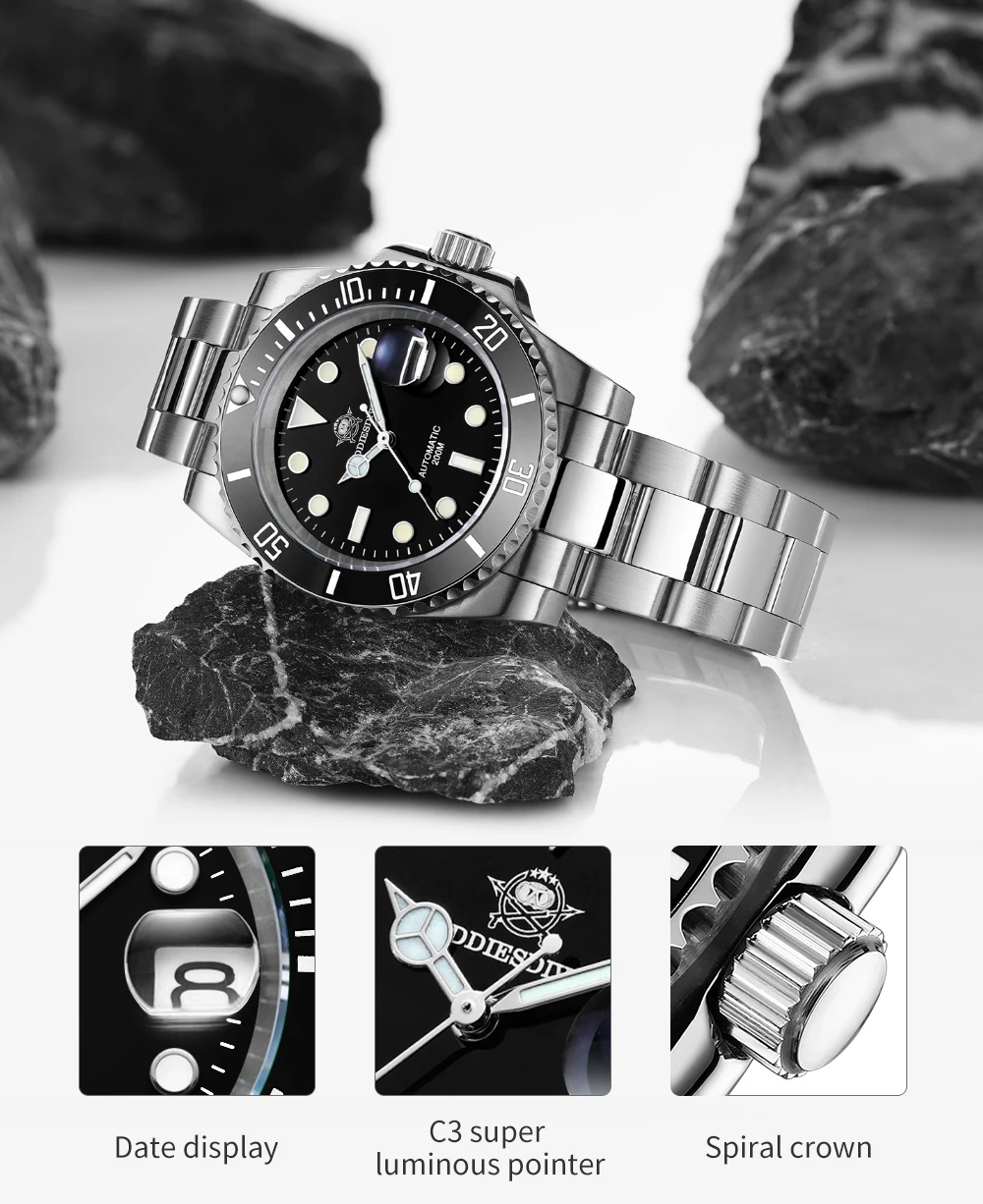 Высококачественный вращающийся керамический ободок, простой, но четкий циферблат с 3d-шкалой и супер светящимися стрелками, все эти дизайнерские часы делают погружные часы более модными, но и функциональными.