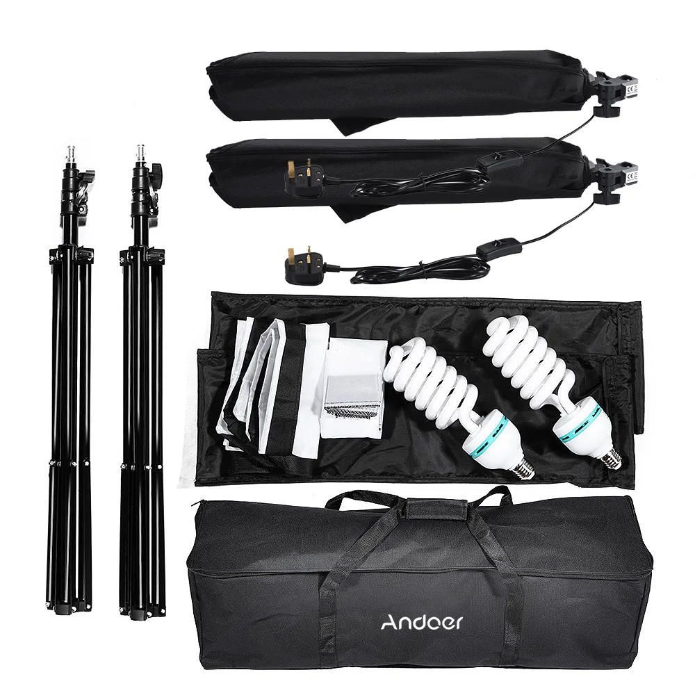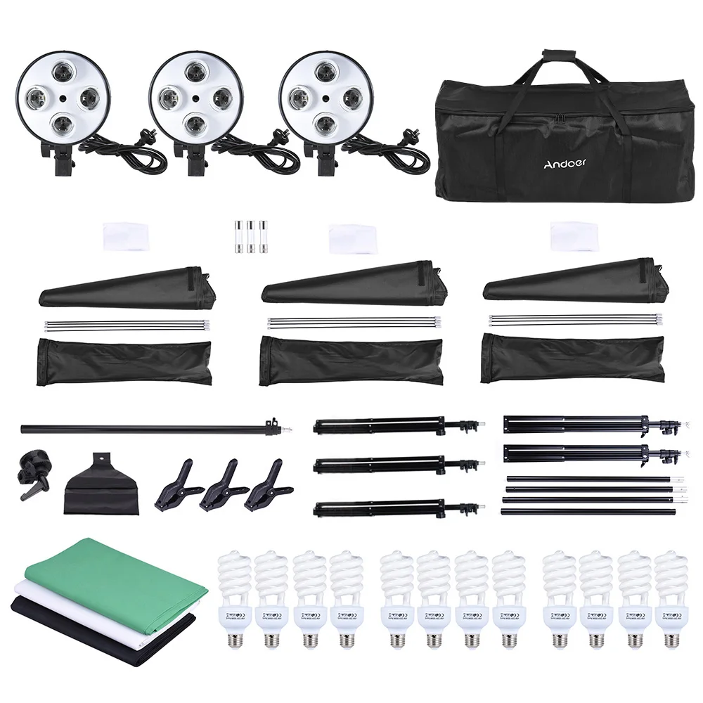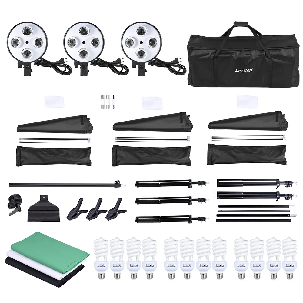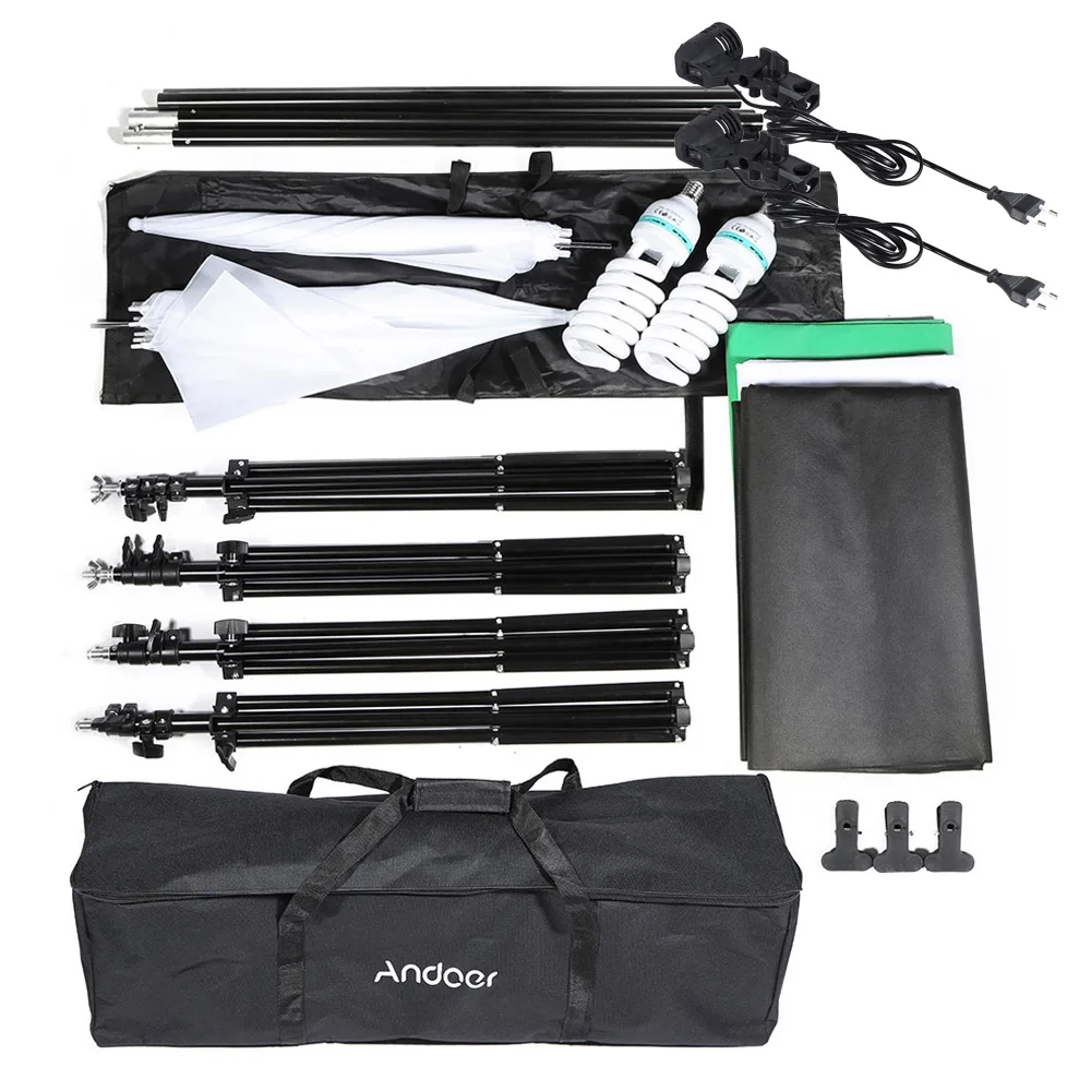 Комплект освещения Andoer для фотостудии включает софтбоксы, консольные палки светильник световые стойки, лампы 4 в 1, лампы, фоны (черные, белые и зеленые), подставку для фона, пружинные зажимы и сумку для переноски Andoer, хороший партнер для студийных фотографов.
