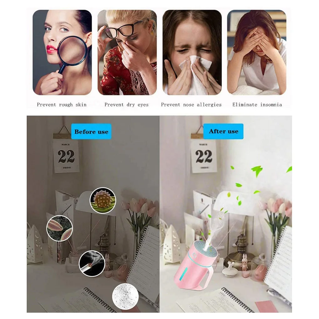 Портативный увлажнитель воздуха реализует бесшумное увлажнение, которое может облегчить простуду и сухость.