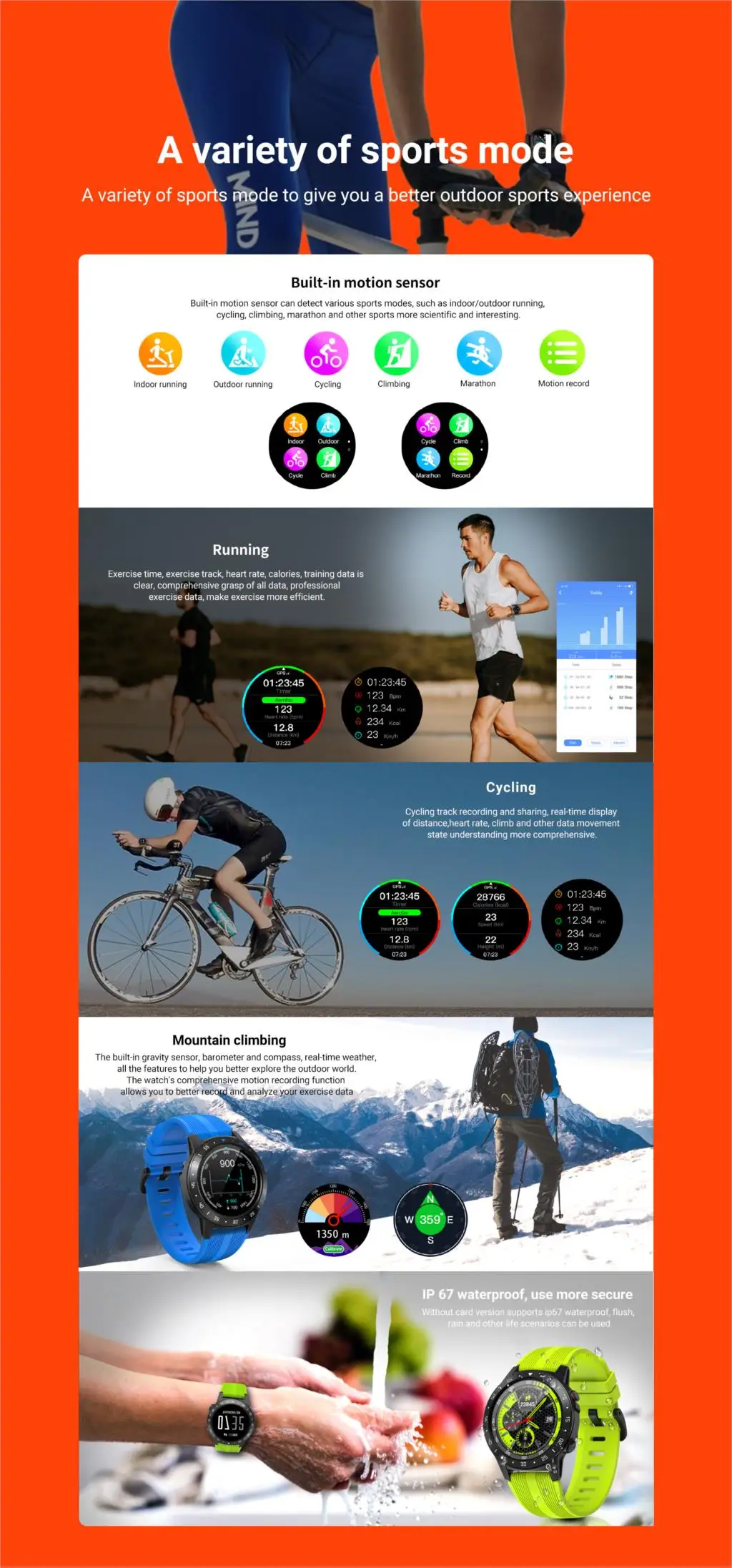 Описание Материал корпуса: поликарбонат + стекловолокно + сплав Материал ремешка: жидкий силикон Размер экрана (дюймы): 1,3 дюймов IPS сенсорный экран на весь экран Разрешение: 240*240 точек/дюйм Сенсорный экран Панель: 1,3 дюймов емкостный сенсорный экран полный сенсорный экран Встроенный аккумулятор Ploymer Емкость: литий-ионный полимер320mah Время работы: 2-3 дня Время работы в режиме ожидания: 5-7 дней Технические характеристики Набор микросхем: MTK2503A-ARM7 Встроенный GPS: керамическая антенна GPS Компас, давление воздуха, высота Расстояние подключения Bluetooth: Двойной режим Bluetooth 3,0 + 4,0, Bluetooth Эффективное расстояние 8-10 м Память (Rom + Flash):128 МБ + 64 Мб Хранение данных: не менее 7 дней Sim-карта: Поддержка версии GSM (Nano sim-карта) Водонепроницаемость: IP67 Тип зарядки: USB Магнитный тип зарядки Встроенный циферблат часов: 8 различных циферблатов Особенности Автоматическая запись активности (ходьба, расстояние, калории) Встроенный GPS трек записи (открытый бег, Велоспорт, альпинизм, марафон) Статический Динамический монитор сердечного ритма в реальном времени/поддержка монитора артериального давления Автоматический монитор сна Поддержка Bluetooth звонков/версия GSM поддержка Nano sim-карт звонков/поддержка телефонных контактов/поддержка набора часов Напоминание о сообщениях в социальных сетях Управление камерой, Bluetooth воспроизведение музыки/микрофон/динамик/Синхронизация с мобильный телефон музыкальный плеер, анти-потеря напоминание Погода в реальном времени, калькулятор/таймер/секундомер, светодиодный светильник, музыкальный проигрыватель, функция поиска, напоминание о сидячем положении Пусковая установка Приложение: английский/китайский/французский/испанский/итальянский/Венгерский/Португальский/румынский/украинский/русский/польский/Корейский/индонезийский/голландский/Датский/немецкий/Шведский/тукийский/Финский/Чешский/японский/словацкий/(поддержка добавления большего количества языков) Язык часов: китайский, английский, французский, испанский, польский, португальский, итальянский, голландский, турецкий, русский, немецкий