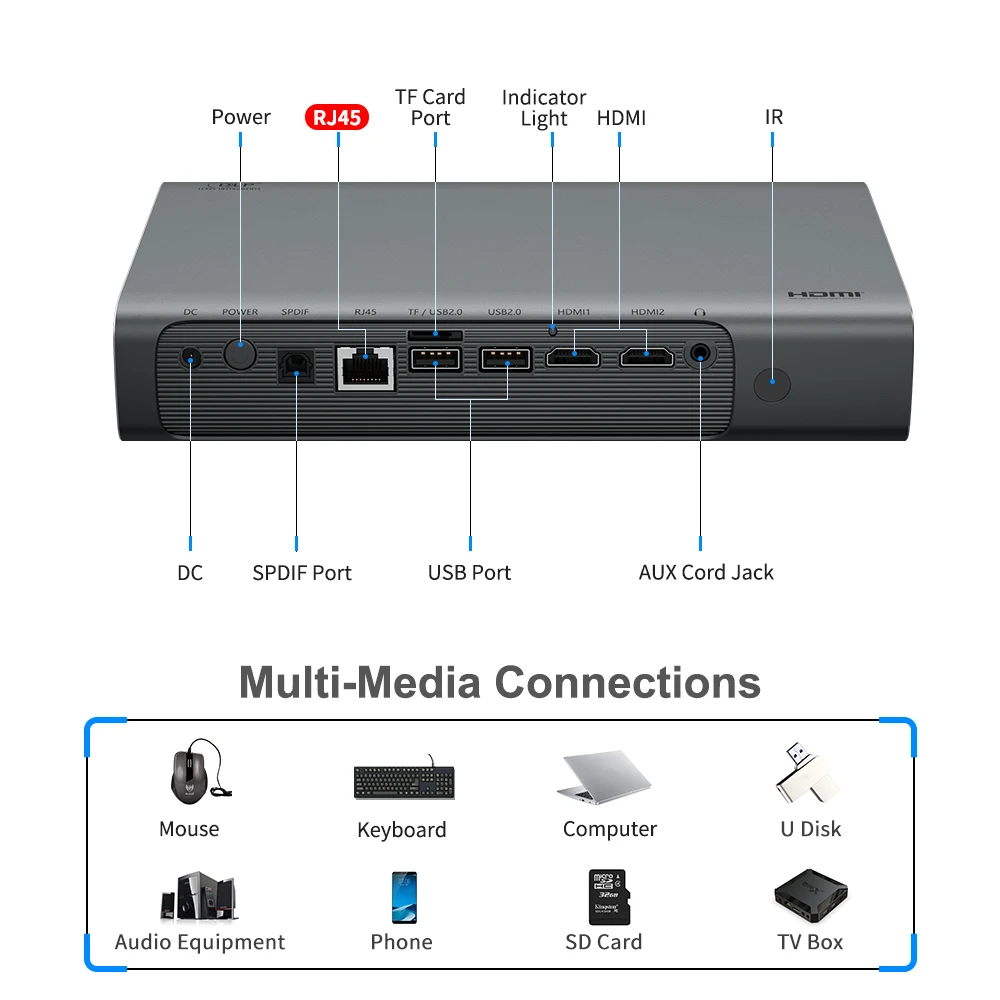 Собственное разрешение проектора 1280 * 800 поддерживает Full HD 1080p, от HDMI-кабеля поддерживает 2K 4K, что вредно для профессиональных презентаций и просмотра фильмов.