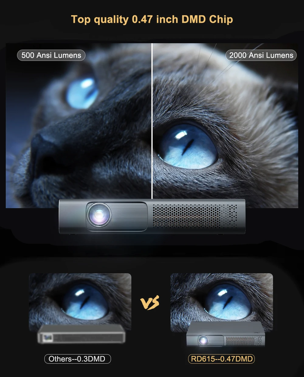 Яркость проеткора 2000 ansi lumens.RD615 проектор показать более яркие, детализированные и красочные изображения.