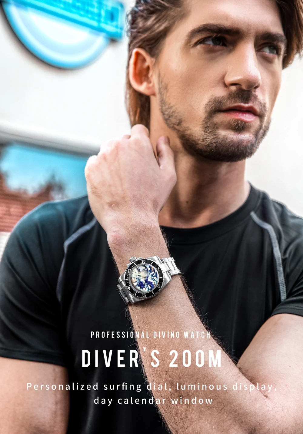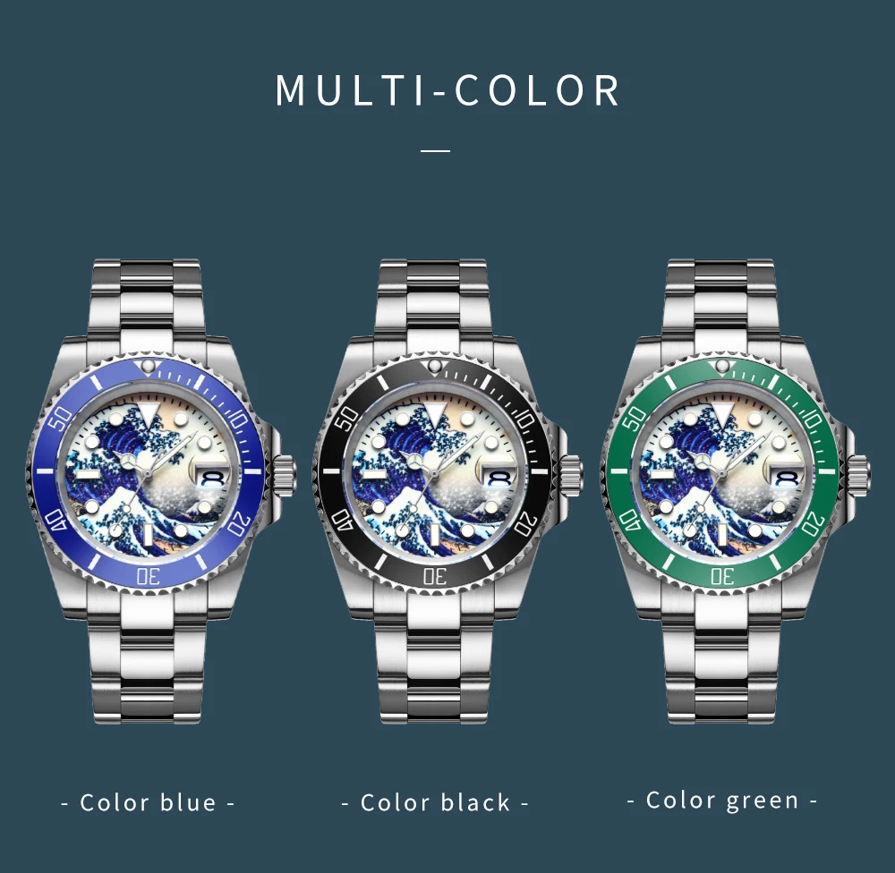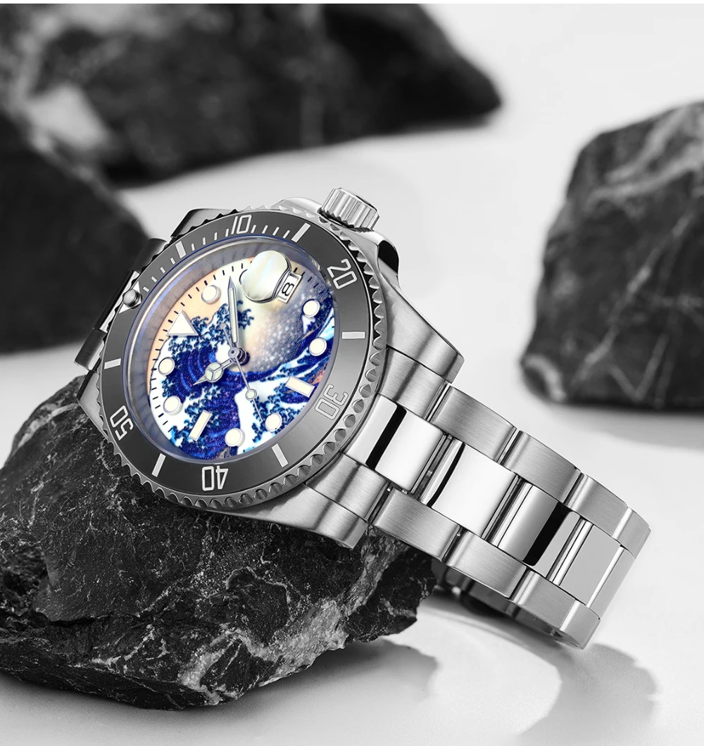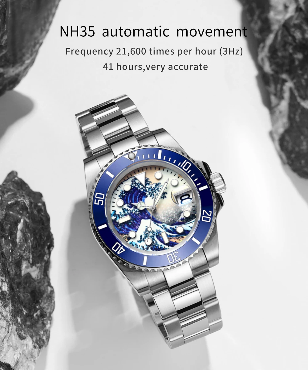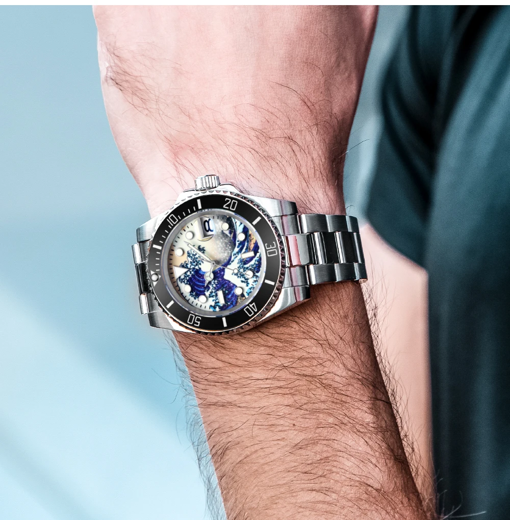 «Великая волна канаваги»-это красочный укио-е принт, созданный японским художником кацушикой Хокусай в начале 19 века. Морские волны возле моря канагава великолепны и поднимаются. Под волнами наступают три корабля. Чтобы выжить, храбрые лодочники яростно сражаются с великими волнами. Чтобы отдать дань Бесстрашному духу героических лодочников канагава, ADDISDIVE запустил эту серию циферблатов для серфинга. Характеристики этой серии с жесткими и красивыми линиями, отличным дизайном волн и водонепроницаемостью до 200 м.