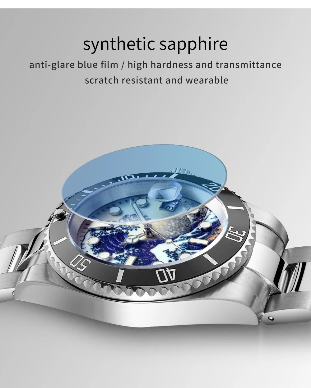 Антикоррозийный корпус из нержавеющей стали 316L диаметром 41 мм и толщиной 13 мм имеет компактный дизайн, благодаря которому эти часы обладают водонепроницаемостью до 200 метров. Изогнутое системное сапфировое стекло с антибликовым синим покрытием повышает прозрачность циферблата.