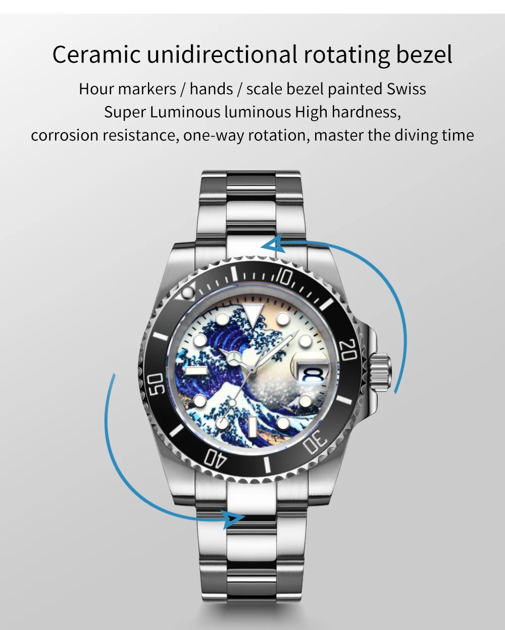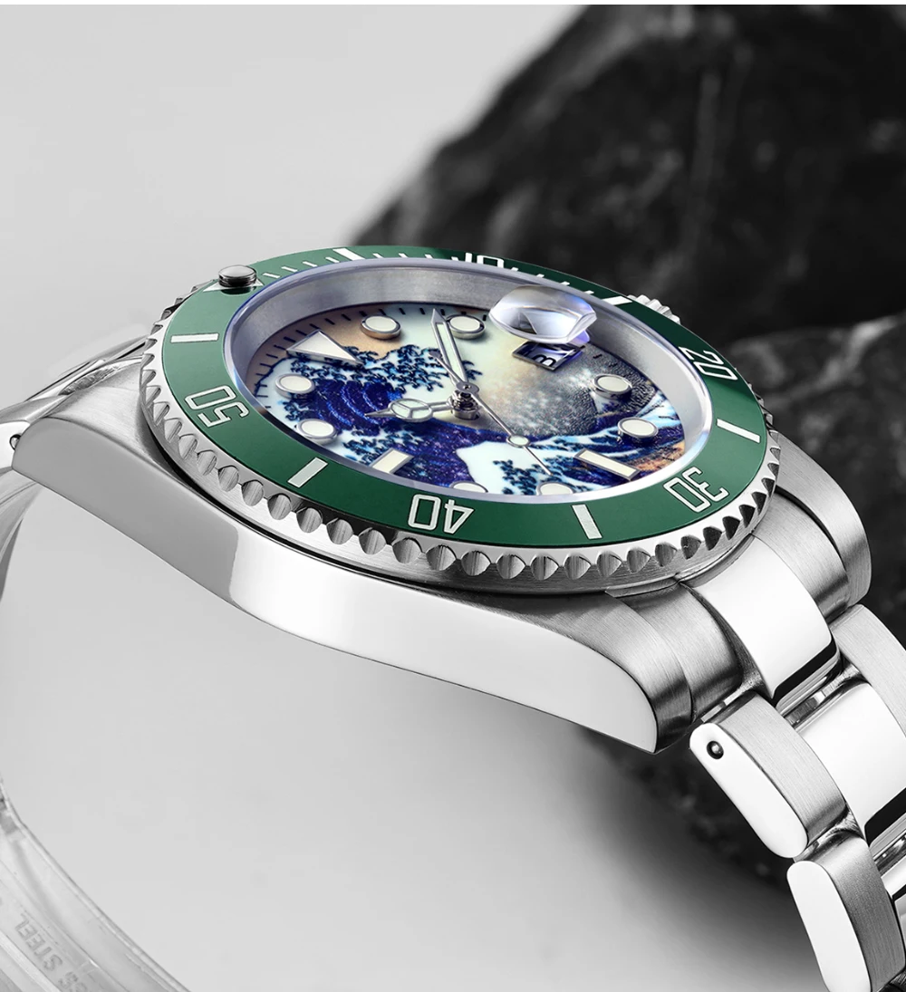 Вращающаяся Безель в одном направлении необходима для часов дайвера. Керамический Безель со сверх светящимся светильником Швейцария BGW9 превращает эту носимую классическую модель часов для дайвинга в более высокое качество, что не может быть сделано другими аналогичными часами для дайвинга SUBMARINER.
