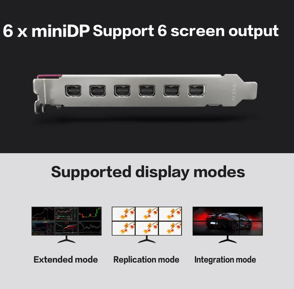 6 портов miniDP поддерживают 6 разделенных экранов, обеспечивают три режима отображения-расширенный режим, режим репликации и режим интеграции, вы можете свободно настроить.