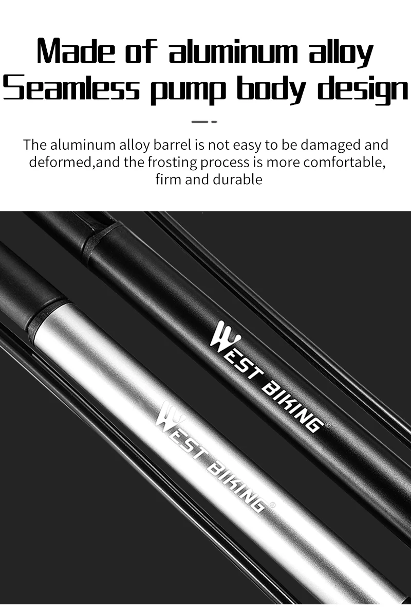 Бренд: WEST BIKING Цвет: серебристый/черный Наименование: портативный насос высокого давления Вес: около 192 г Материал: алюминиевый сплав Размер: 35*4,5 см Применение: клапан Schrader Presta Давление воздуха: 120 PSI Характеристики: легко носить с собой, с собственной фиксирующей рамой, которую можно зафиксировать в положении чайника