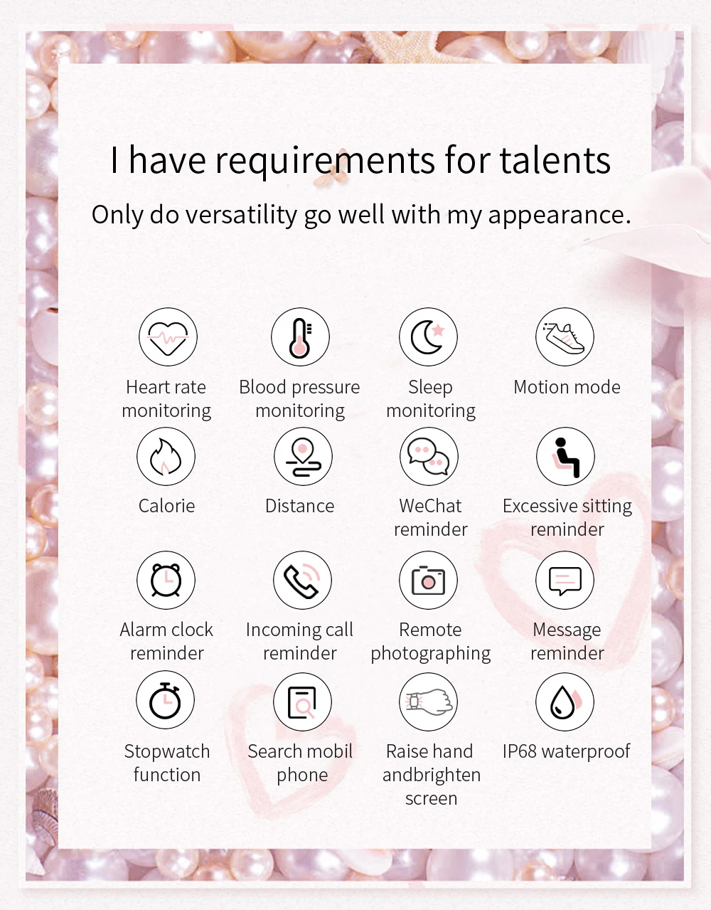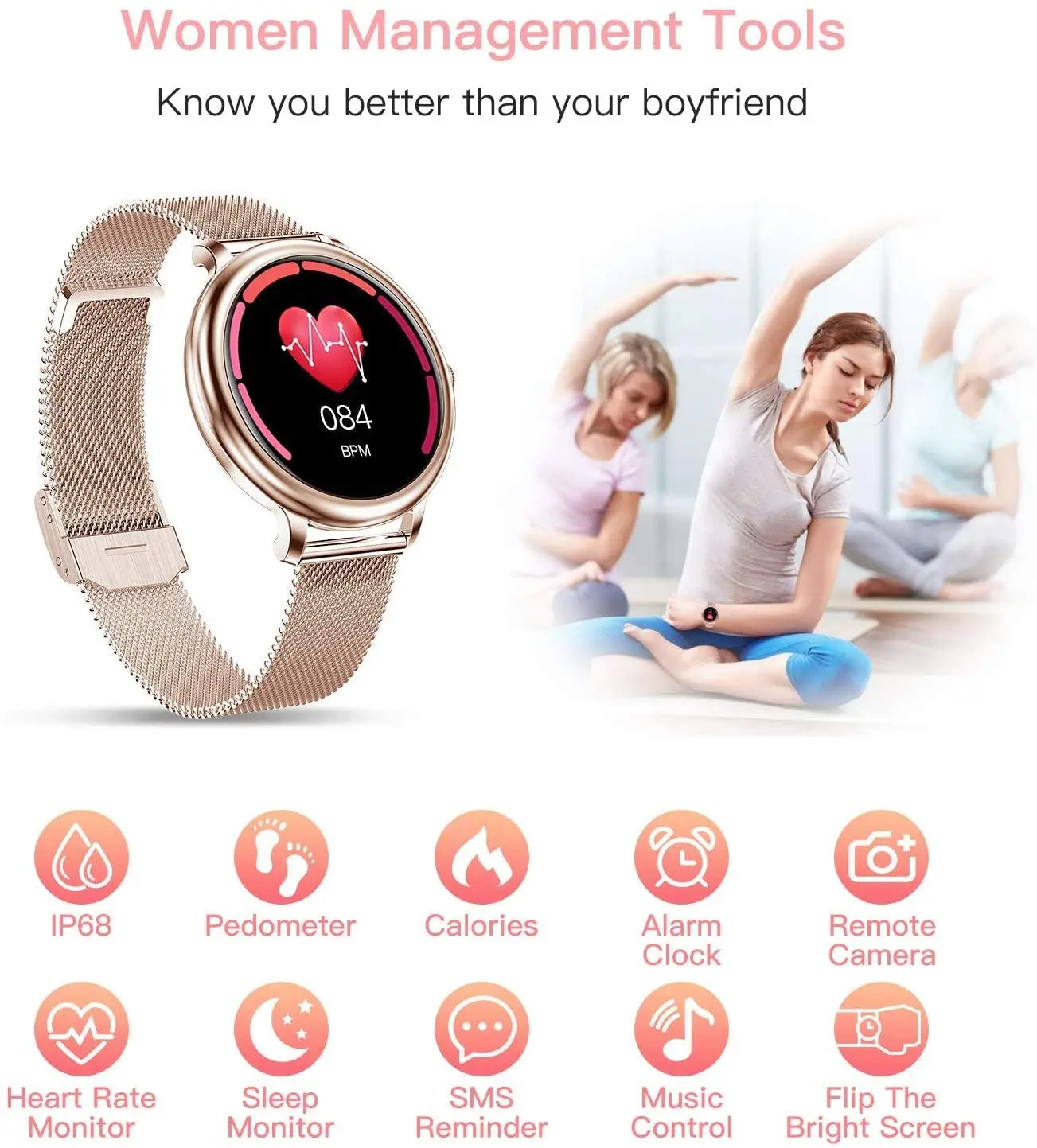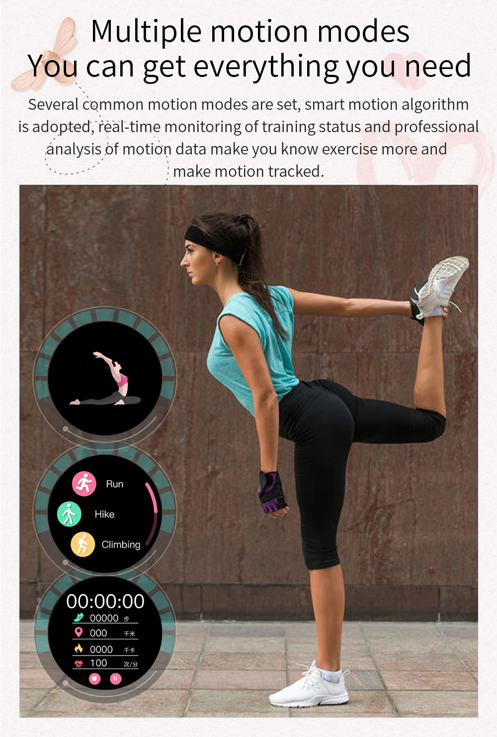 Измерение частоты сердечных сокращений, мониторинга сна, отслеживание здоровья, управление музыкой, скалолазание, секундомер, Смарт-часы с будильником, 24 часа в сутки, отслеживание активности, 9 спортивных режимов, уведомления, управление музыкой, функция напоминания о необходимости двигательной активности, будильник, секундомер и т. Д.