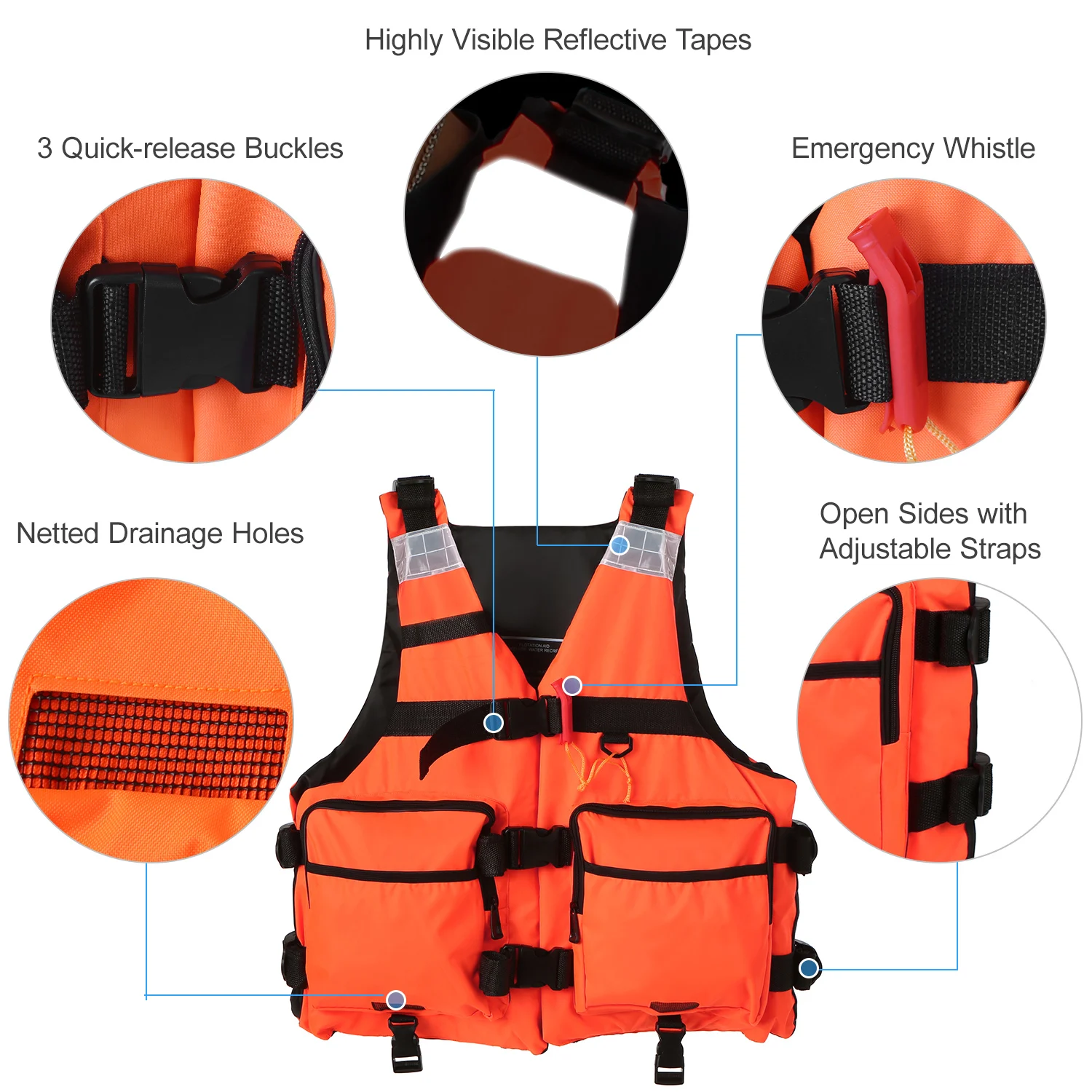 Этот спасательный жилет изготовлен из устойчивой к царапинам ткани из полиэстера и легкой флоационной пены для долговечности. Он имеет два кармана на молнии и два открытых кармана, чтобы обеспечить достаточно места для хранения ваших вещей. Дизайн с тремя пряжками, регулируемые лямки и открытые бока делают куртку надежно и комфортно на вас. Светоотражающие панели повышенной видимости и прилагаемый свисток помогут повысить безопасность во время занятий водными видами спорта, такими как каяк, рыбалка, парусный спорт, водные лыжи и многое другое.
