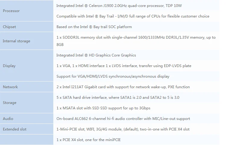 ♦ITX-S192_A925S VER: 1,0 промышленная доска ♦Интегрированная Intel®Четырехъядерный процессор Celeron J1900/2,00 ГГц ♦На базе Intel®Платформа Bay trail SOC ♦1 слот памяти DDR3LSODIMM с поддержкой SODIMM 1600/1333 МГц, до 8 Гб ♦1 x VGA, 1 x HDMI интерфейс 1 x LVDS интерфейс, реализован путем передачи EDP-LVDS пластины ♦2 гигабитная карта Intel I211AT поддерживает Network Wake/PXE ♦1 слот PCIE X4, с MINIPCIE на второй выбор