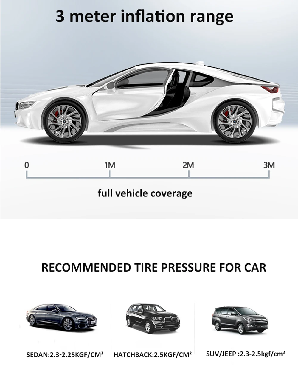 Надувает P185/R14 от 0 до 28 PSI приблизительно за 2 минуты или меньше. Подключите непосредственно к гнезду прикуривателя вашего автомобиля. Запуск двигателя, и подключение винта на шинный патрон к штоку клапана шины перед включением блока. Автоматическое отключение быстро и точно. Простота в эксплуатации. Автоотключение при достижении нужного давления в шинах. Защита от перегрева отключается автоматически при перегрузке. Удобный для чтения манометр для шин насос для шин оснащен большим высокоточным и ярким дисплеем, который поможет рассчитать необходимые значения. Доступно 4 единицы дисплея: PSI, кПа, бар, кг/см2. Яркий светодиодный фонарик этот воздушный компрессор имеет встроенный яркий и долговечный светодиодный фонарик, которые позволяют легко работать или делать быстрый ремонт в темное время суток и убедиться, что вас видят в экстренной ситуации, чтобы избежать любых потенциальных опасностей во время работы. Многофункциональный портативный насос для автомобильных шин поставляется с 10-футовым шнуром питания и надувными адаптерами (3 дополнительных сопла), что делает его идеальным для автомобилей, грузовиков, квадроциклов, CRV, джипов, внедорожников, мотоциклов, велосипеды, надувные лодки, спортивные мячи, надувной матрас, водные игрушки и другие надувные изделия. Спецификация: Цвет: серый Материал: Пластиковый корпус + медный мотор Рабочее напряжение: 12 В постоянного тока Питание: прикуриватель Рабочий ток: ≥ 10A Номинальная мощность: 120 Вт Скорость потока: 35 л/мин Максимальное значение давления: 150PSI Единицы отображения: кПа, PSI, бар, кг/см² Длина шнура питания: 10 футов Длина шланга: 2 фута Время непрерывной работы: максимум 8 минут Размер: 20,4*15,7*8,9 см Вес изделия: 1,7 фунта Содержимое упаковки: 1 * Цифровой воздушный компрессор 1 * резервный предохранитель 3 * насадки-адаптеры