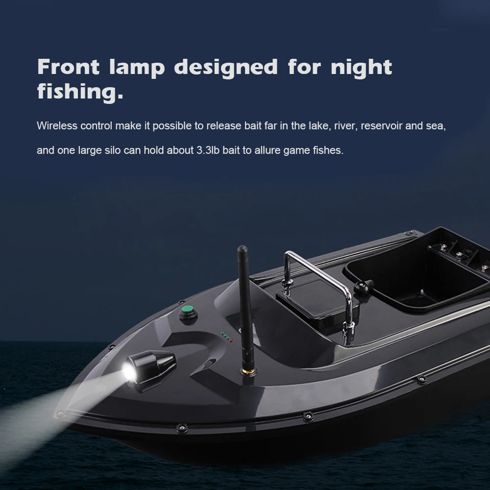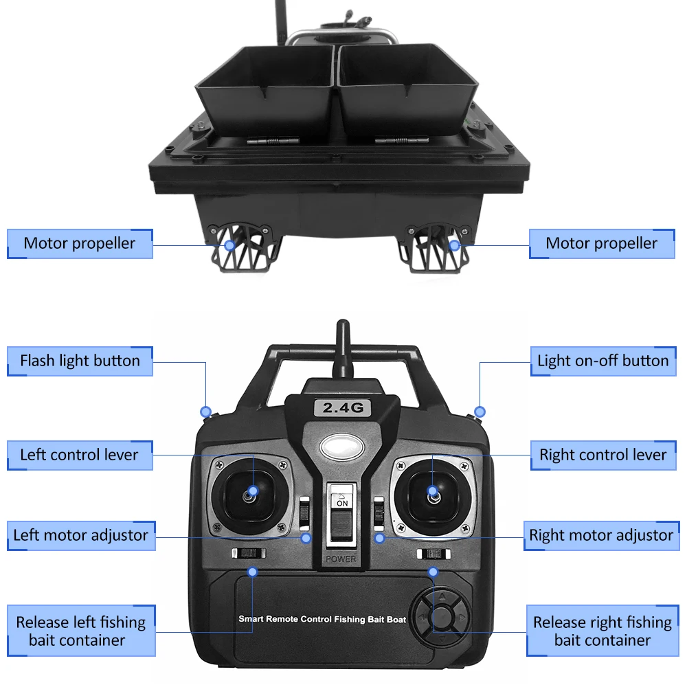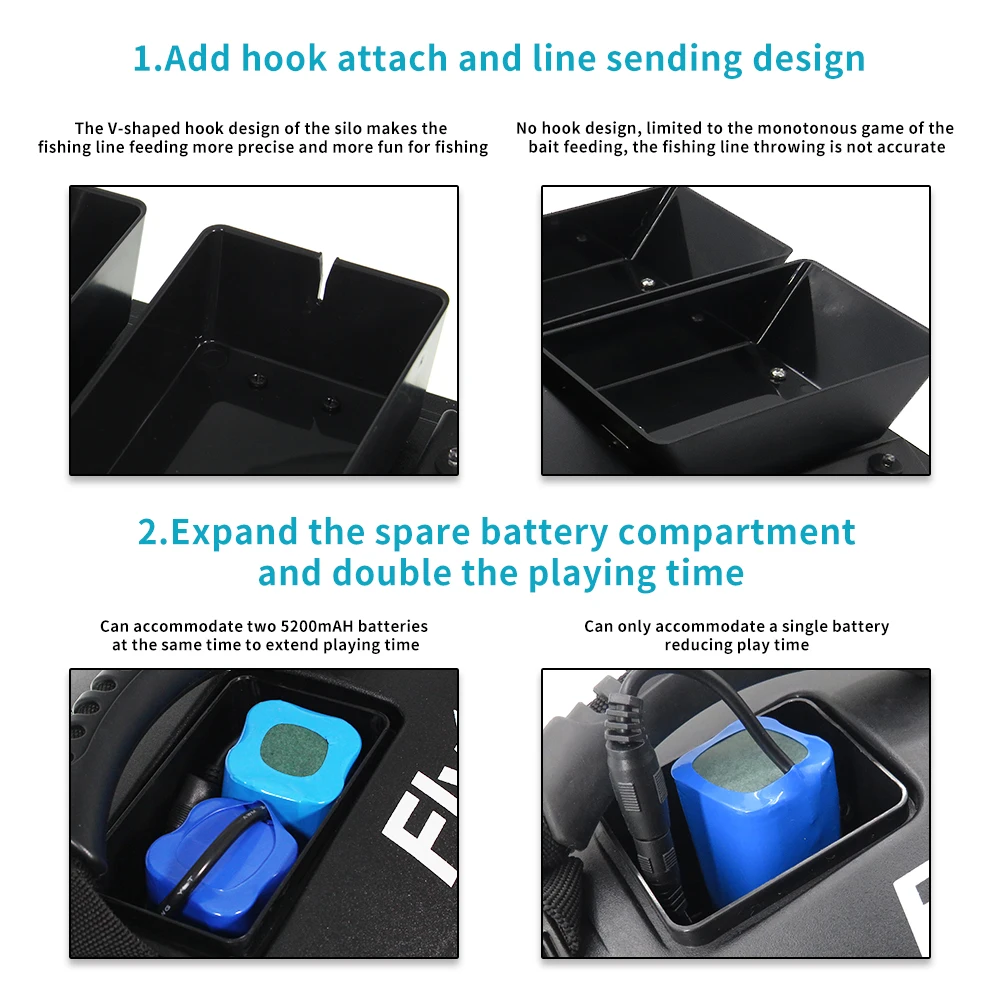 Беспроводное управление позволяет выпустить приманку далеко в озере, и двойной силос может держать больше приманки для всех игровых рыб. Простота в эксплуатации для любителей рыбалки или начинающих.