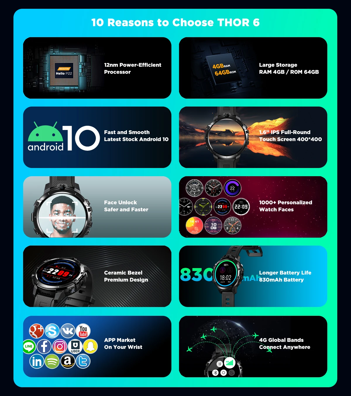 Сеть 4G (глобальные полосы), разблокировка лица, GPS/ГЛОНАСС, Google Play, голосовой поиск, офлайн музыка, WiFi, погода, циферблат часов для любого случая (Пользовательские циферблаты), приложения, часы лица и уведомления, телефонная книга, будильник, Bluetooth, браузер, календарь, камера, электронная книга, MP3, MP4, Монитор сердечного ритма, шагомер, напоминание о звонках, удаленная музыка, уведомление о сообщениях, удаленная камера, ответ на вызов, вызов на циферблат.