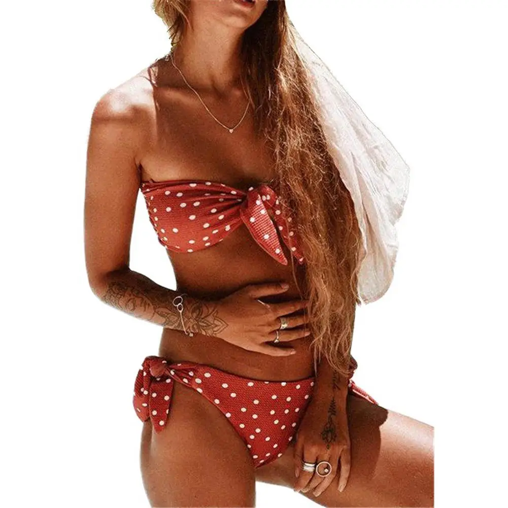 Комплект из 2 предметов: женский бюстгальтер без бретелек в горошек с бантиком, комплект бикини, сексуальный пляжный купальник