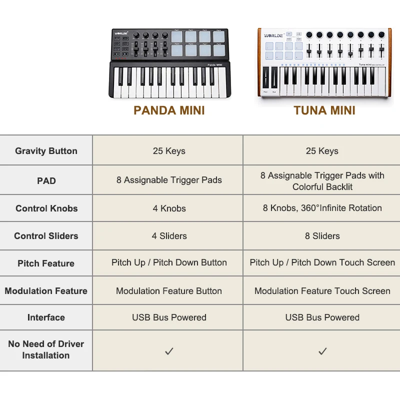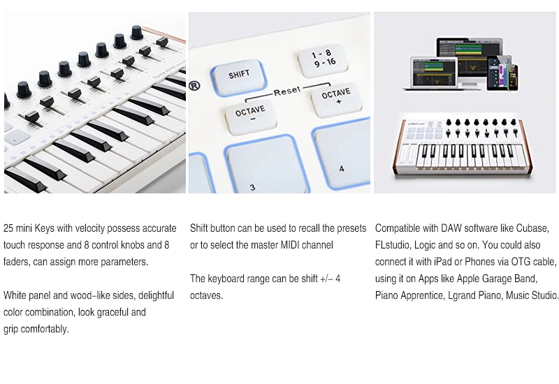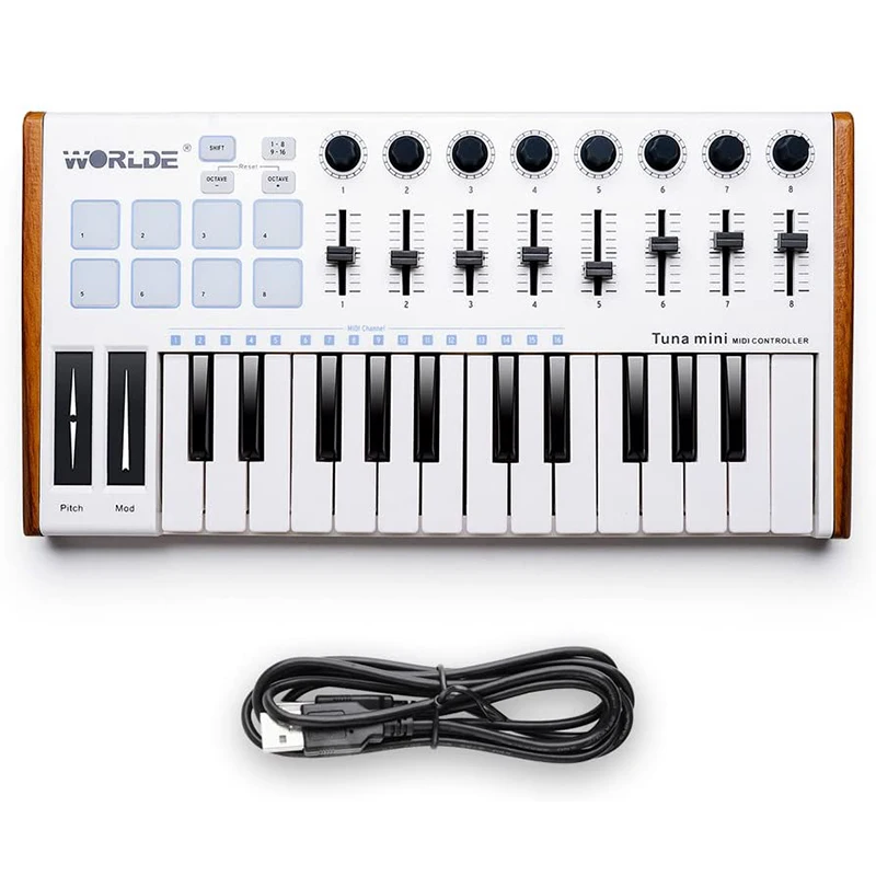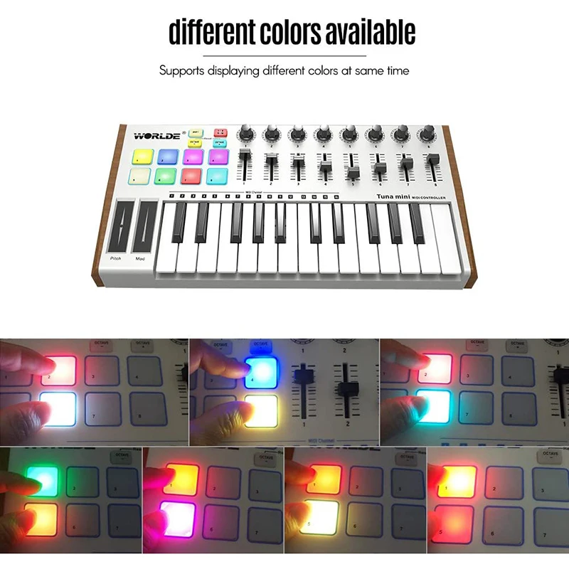 8 кнопок управления: CC Mod, Mod, Bank, Prog, Pitch down / Pitch up, Octave down / Octave up.