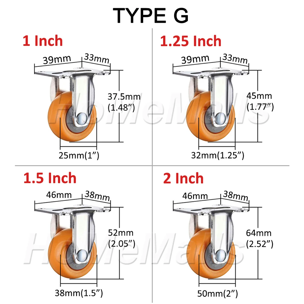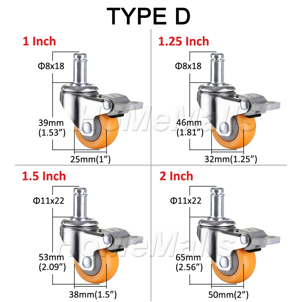 Диаметр колеса: 1 дюйм (25 мм)/1,25 дюймов (, маленького размера, круглой формы с диаметром 32 мм)/1,5 дюймов (38 мм) / 2 дюйма (50 мм)