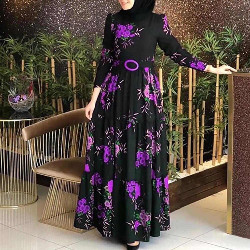 Женское мусульманское платье с длинным рукавом Abaya, этнический цветочный принт с поясом, макси-кафтан, Халат