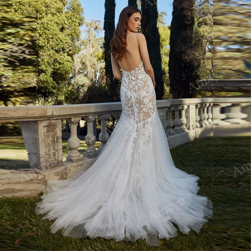 Шампанское Русалка Бохо Свадебные платья Кружева Аппликации v-образным вырезом Страна пляж невесты платье открытая спина Vestidos De Novia
