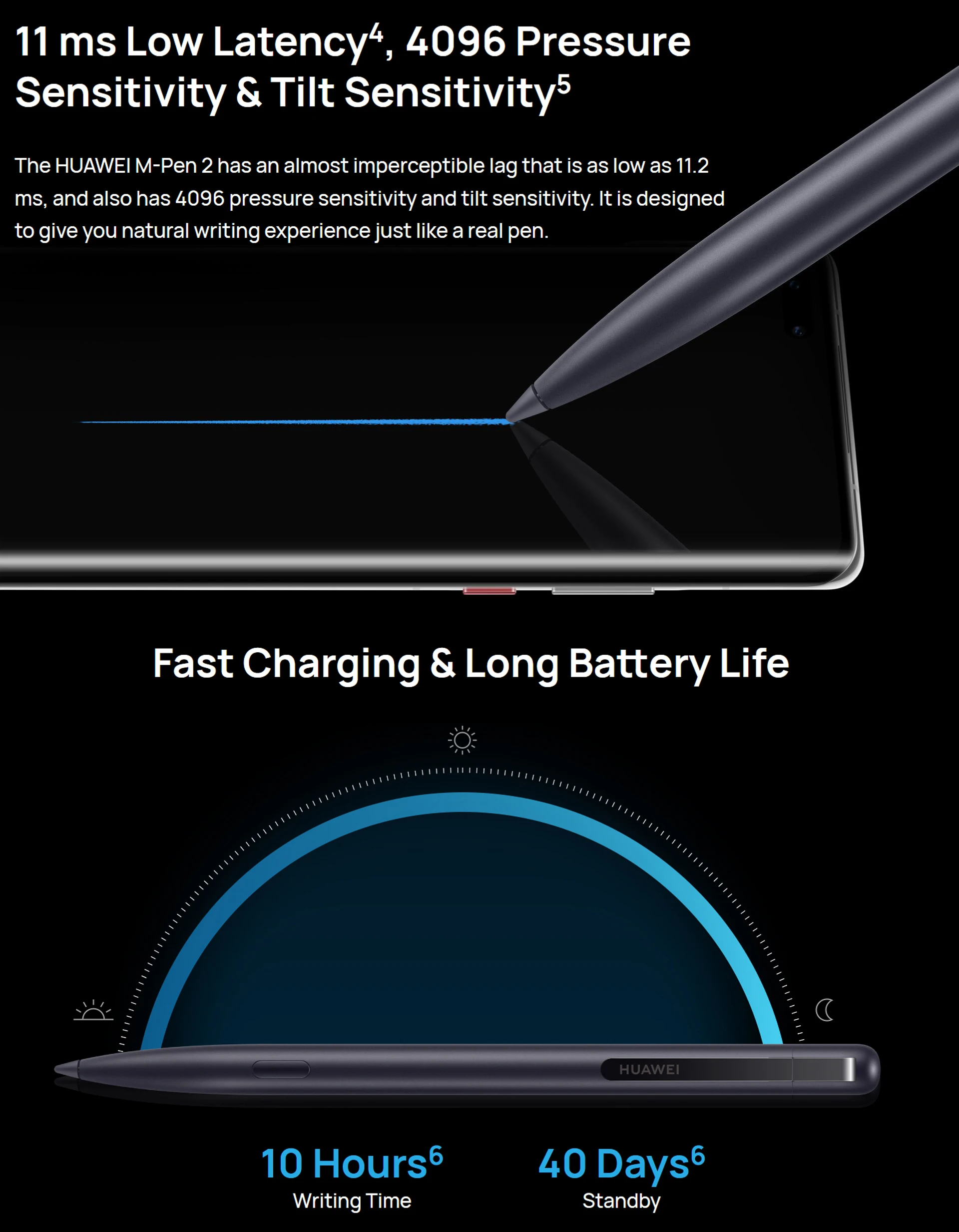 The HUAWEI M-Pen 2 has an almost imperceptible lag that is as low as 11.2ms,and also has 4096 pressure sensitivity and tilt sensitivity.It is designed to give you natural writing experience just like a real pan.