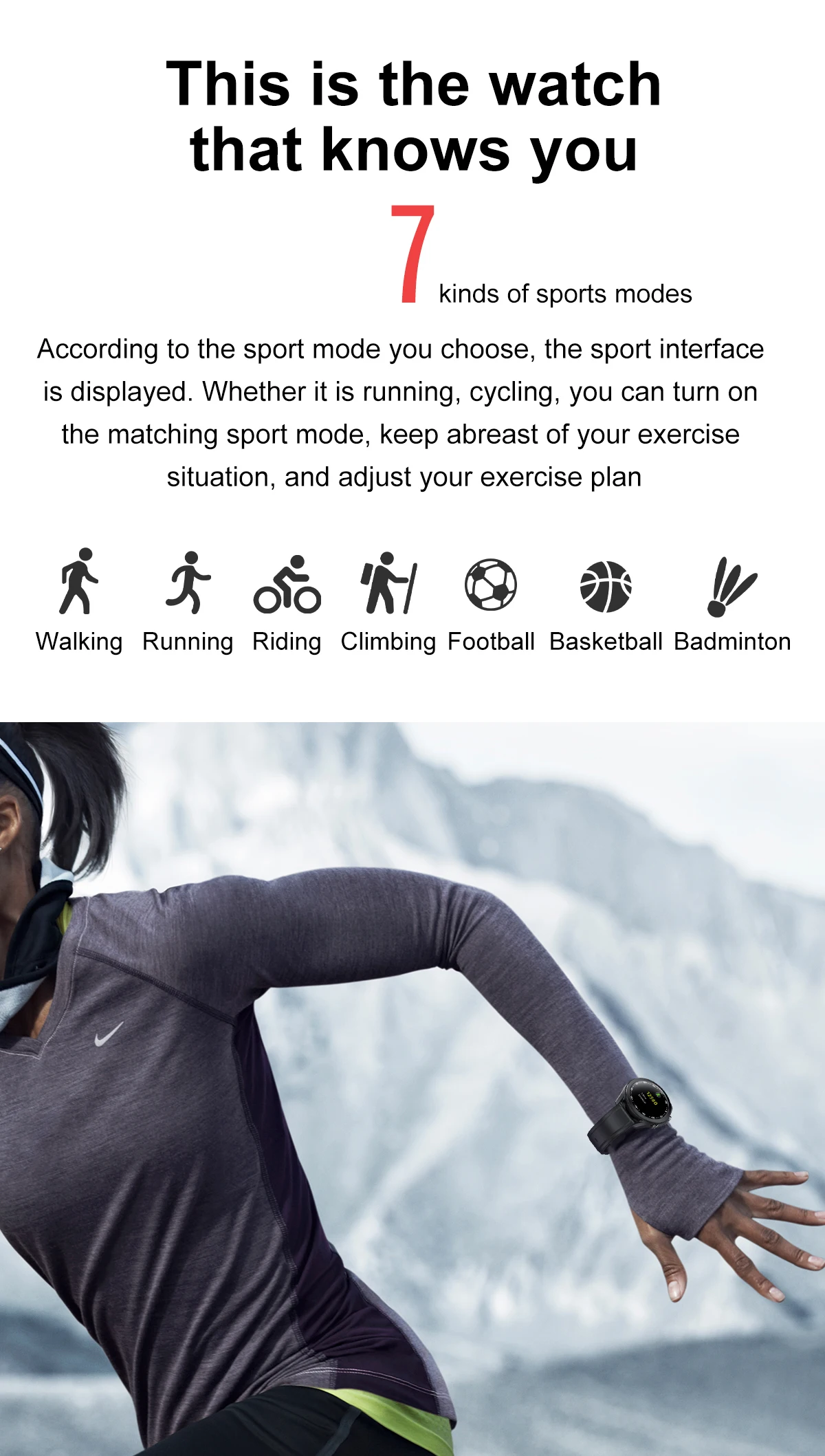 Режим движения: поддержка (7 спортивных режимов: Пешие прогулки, бег, Велоспорт, альпинизм, футбол, баскетбол, бадминтон)