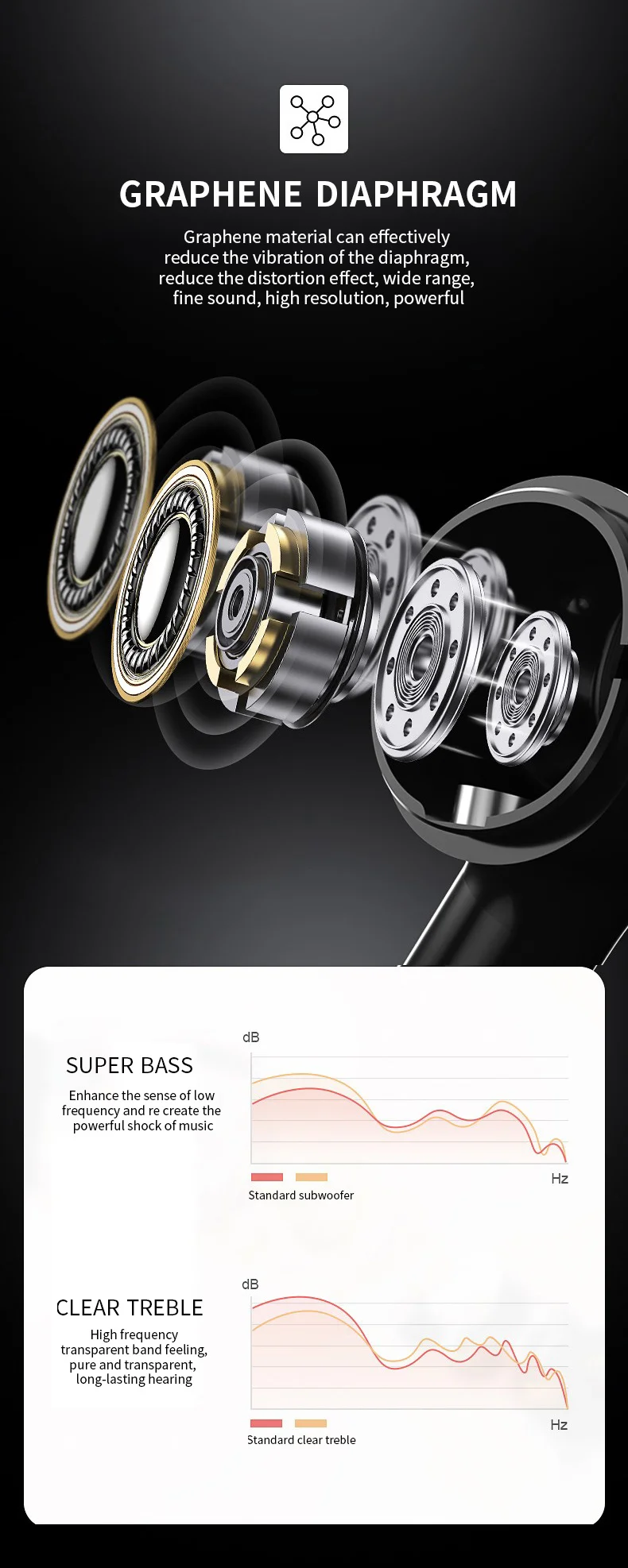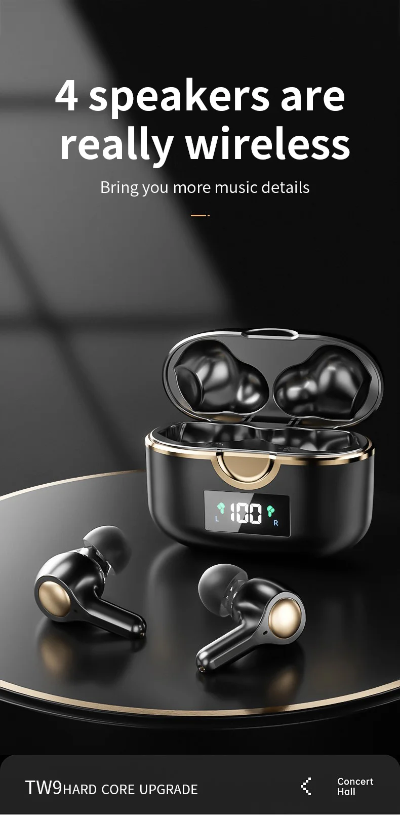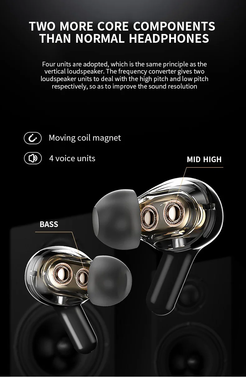 Особенности: 1. Два блока и четыре динамика, качество звука более детальное 2. Интеллектуальная технология шумоподавления вызовов, чтобы сделать звонок более четким 3. Высокая скорость передачи, синхронизация звука с низкой задержкой 4. Умный сенсорный дизайн, удобен в использовании 5. Двойные хост-чипы, стабильное использование и непрерывное соединение 6. Графеновая диафрагма, наслаждайтесь четкими высокими частотами и супер басами Параметры: Версия Bluetooth: V5.0 Емкость зарядного устройства: 300 мА · ч Время зарядки: около 1,5 ч Время использования: около 4 ч (60% объем) Время работы в режиме ожидания: около 120 ч Расстояние подключения: 10 м