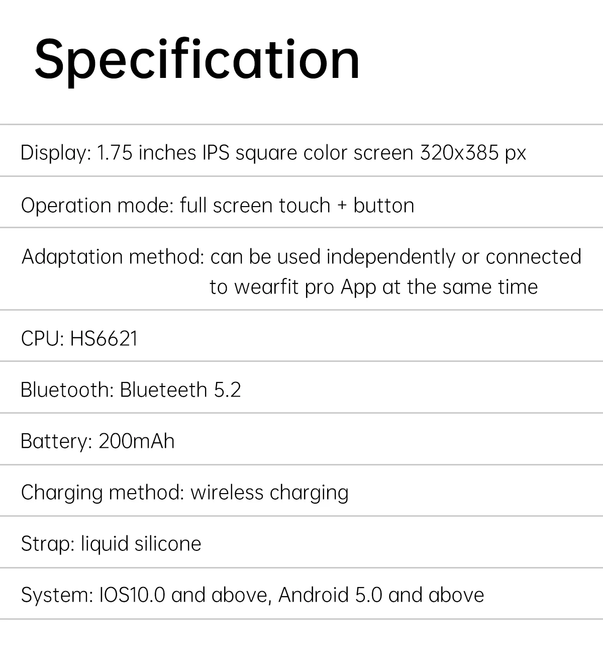 1. Модель: HW22 Plus 2. Размеры: 44,1*37,9*13,5 мм 3. Экран: квадратный IPS экран 4. Экран Размер: 1,75 дюймов 5. Разрешение: 320*385 6. Чип: HS6621 7. Память: 128 м 8. BT: 5,2 9. Емкость аккумулятора: 200 мАч 10. Способ зарядки: Беспроводная зарядка 11. Срок службы батареи: 1-3 дня (зависит от личного использования) 12. Время работы в режиме ожидания: 25 дней 13. Водонепроницаемость: IP67 14. Системные требования: IOS 10,0 и Android 5,0 и выше