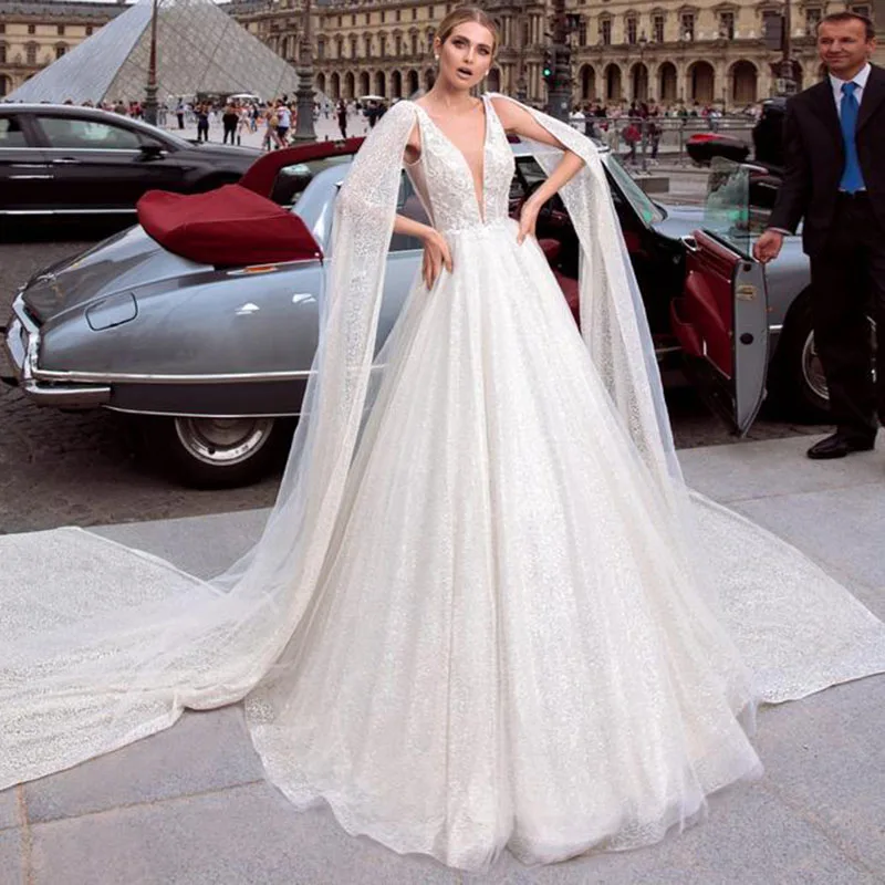 Винтажное свадебное платье принцессы 2021 с v-образным вырезом и открытой спиной, с блестками, Пляжное свадебное платье со съемным шлейфом, блестящее свадебное платье