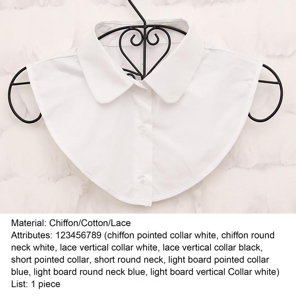 Есть 9 типов поддельных воротников на выбор: 1 Тип-шифоновый Острый Воротник, 2 Тип-шифоновый круглый воротник, 3 Тип-кружевной воротник-стойка, тип 4-кружевной воротник-стойка черного цвета, тип 5-короткий заостренный воротник, Тип 6-короткий круглый воротник, Тип 7-однотонный синий Острый Воротник, тип 8-однотонный синий круглый воротник, тип 9-однотонный белый воротник-стойка.