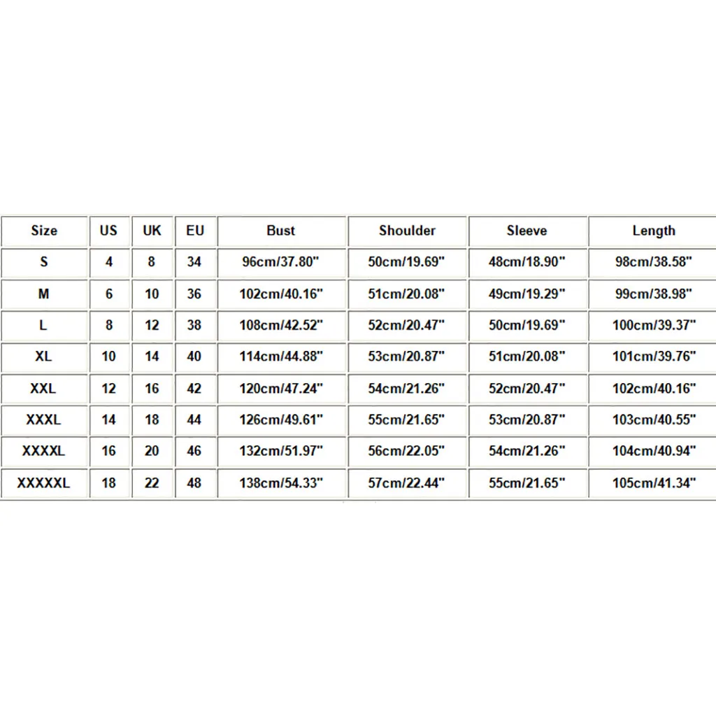 Размер США Великобритания ЕС Бюст Плечо Рукав Длина S 4 8 34 96 см/37,80'' 50 см/19,69'' 48 см/18,90'' 98 см/38,58'' М 6 10 36 102 см/40,16'' 51 см/20,08'' 49 см/19,29'' 99 см/38,98'' L 8 12 38 108 см/42,52'' 52 см/20,47'' 50 см/19,69'' 100 см/39,37'' XL 10 14 40 114 см/44,88'' 53 см/20,87'' 51 см/20,08'' 101 см/39,76'' XXL 12 16 42 120 см/47,24'' 54 см/21,26'' 52 см/20,47'' 102 см/40,16'' XХХL 14 18 44 126 см/49,61'' 55 см/21,65'' 53 см/20,87'' 103 см/40,55'' XXXXL 16 20 46 132 см/51,97'' 56 см/22,05'' 54 см/21,26'' 104 см/40,94'' XXXXXL 18 22 48 138 см/54,33'' 57 см/22,44'' 55 см/21,65'' 105 см/41,34''